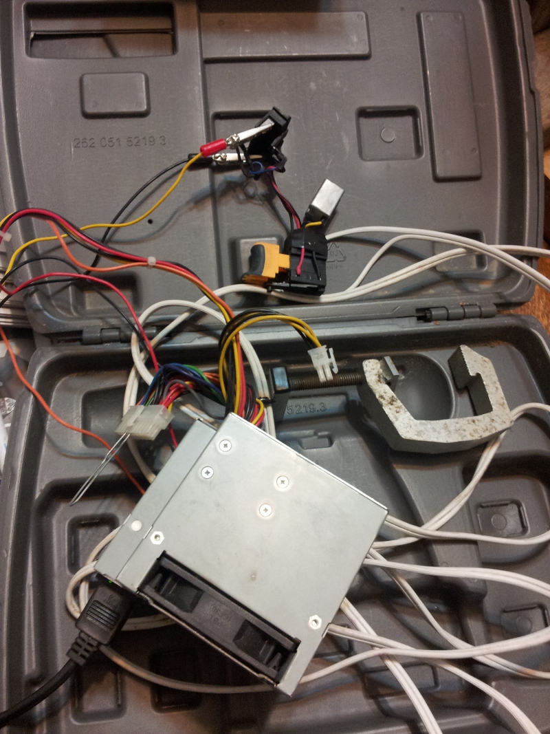 was removed from the drill. A section of regular household extension cord (3m long) was spliced in as an extension between the trigger mechanism