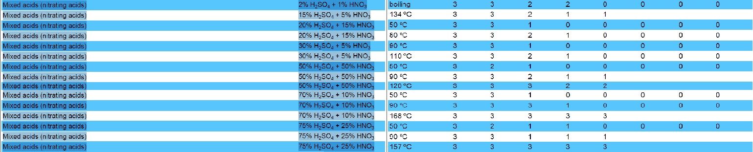Looking at the common stainless steels, it appears as though none are ideally suited for contact with nitration acid though 304 is fair according to