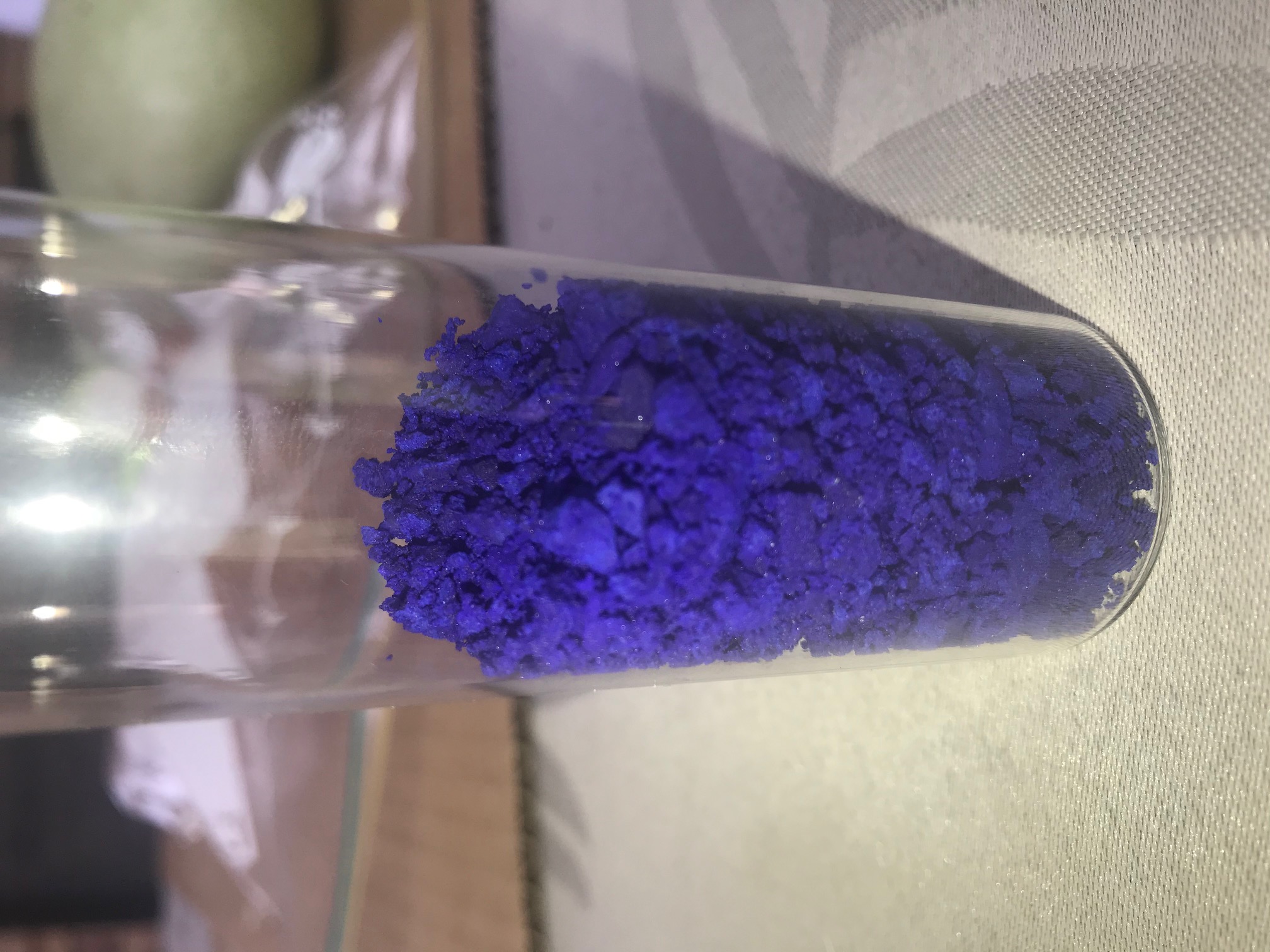 Look at the below photo. All different copper cyanurates. The middle bottle is to me a beautiful deep purple colour and it has kept its colour for