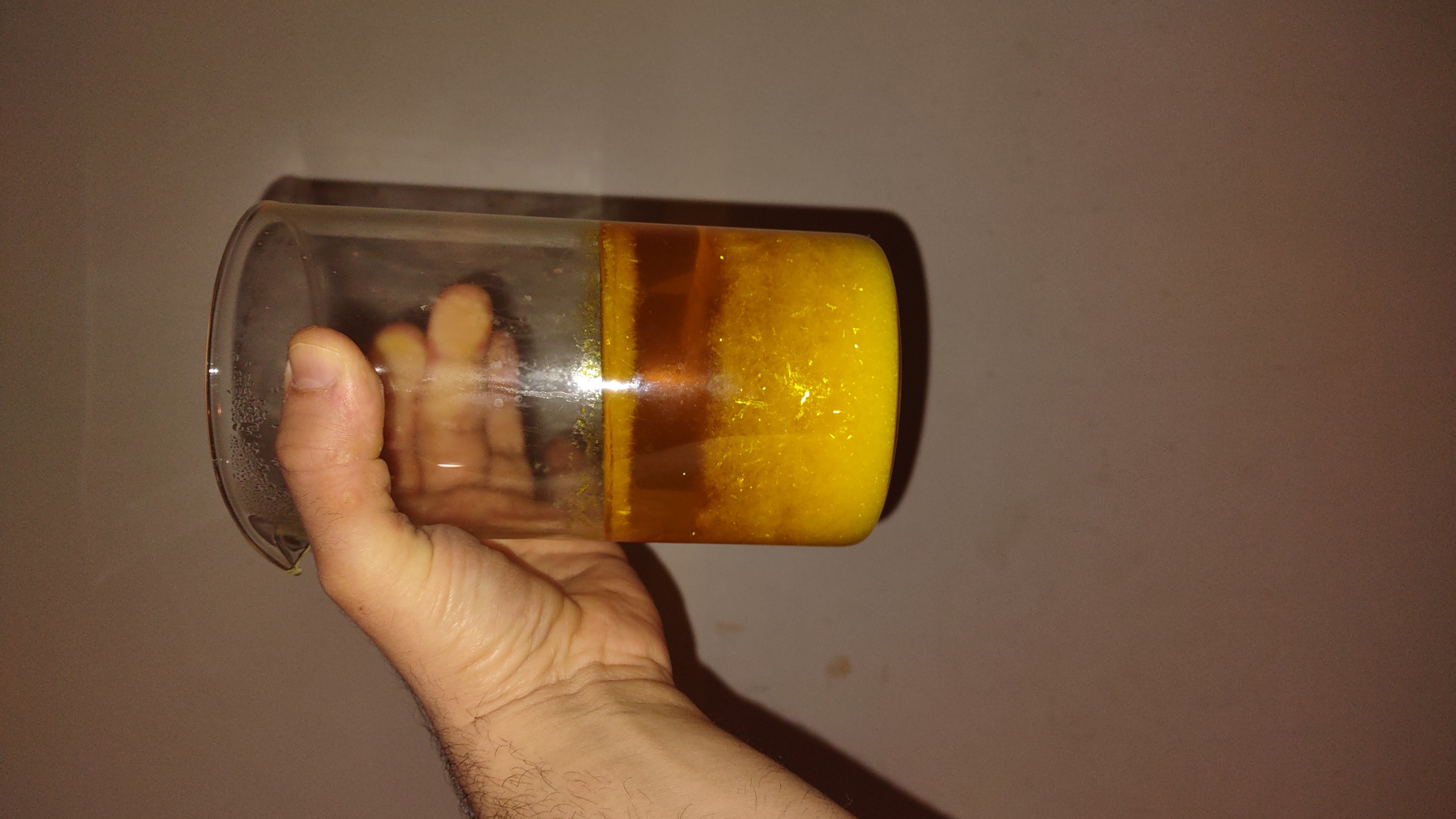 So I did the final picric acid synth and after speaking with someone on a discord group with extensive experience in making picric acid and they told me to try something differently: instead of adding the nitrate salt while it is hot, I did it while it is cold, and this is the result. I haven't done the heating step yet, and I won't do it for another hour or so at least to make sure that nothing is going wrong. Albeit so far (around 30 minutes in) I see that it is going to be OK.