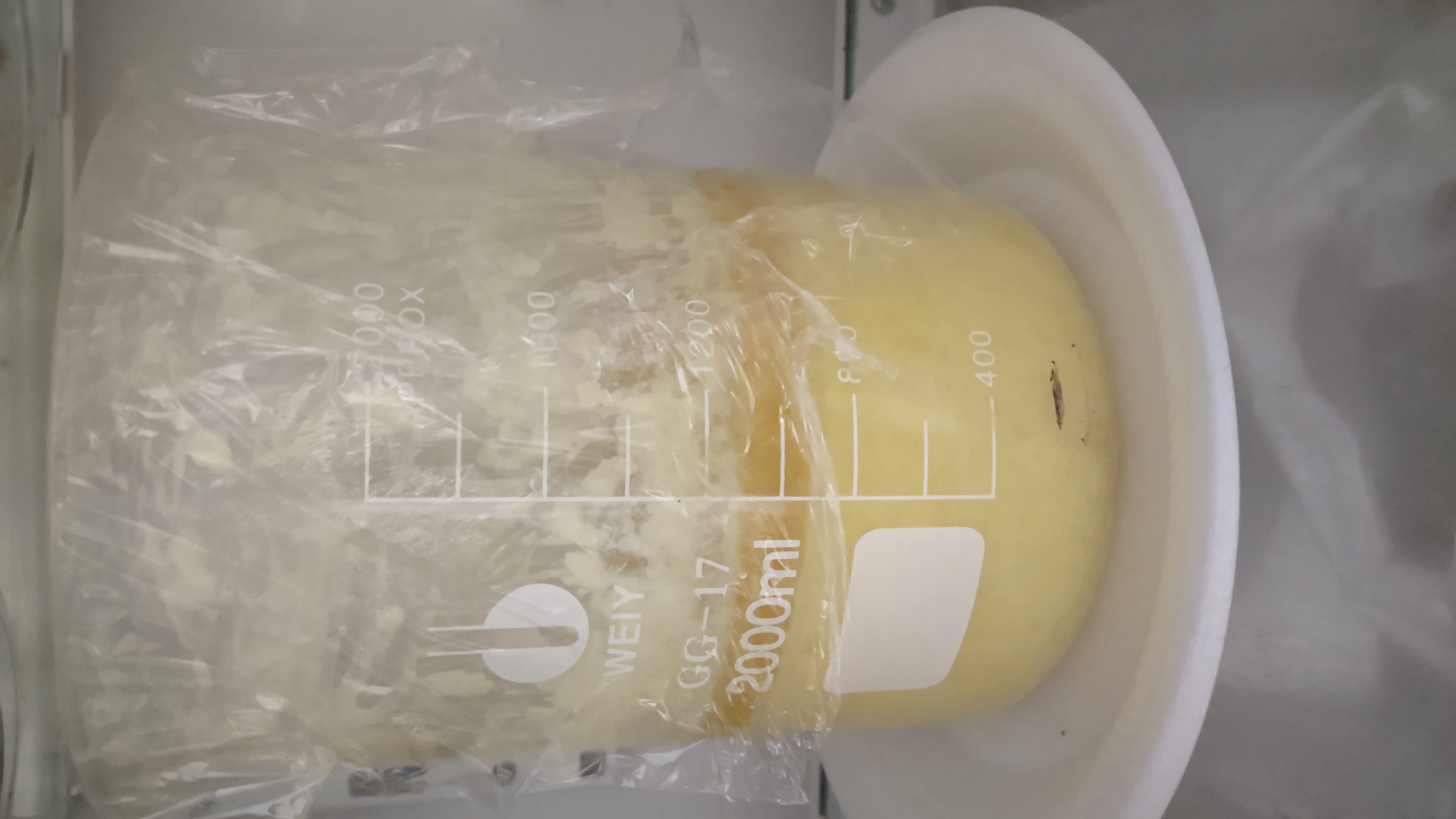 Yeah it is going to be long. I just started adding water to the whole thing. I calculated that there is around 1100ml in volume, so I will need 770ml of water to break everything up. It'll take a while to add everything since I need to do it piece meal and put it back in the fridge to cool down (I did see some warming after adding 100ml or so). I won't be having any of that flash boiling!