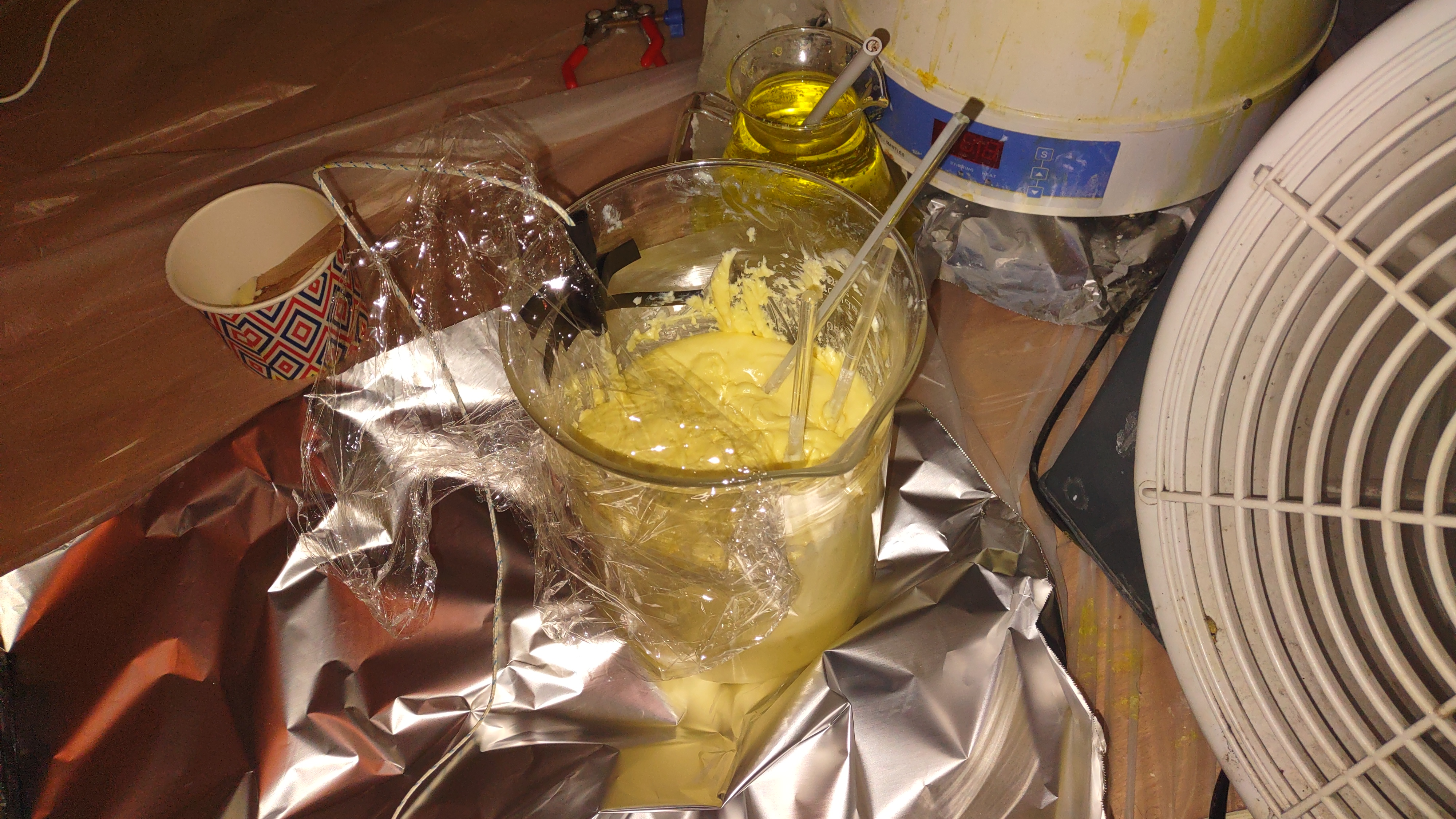 At any rate, my 2nd synth is fully complete, and the weather outside was well enough that I could do the heating step outside (and it was essential). I ran into difficulties with my thermometer which was often inaccurate, but I took great precautions to make sure that I was heating everything SLOWLY and in gradual steps to allow for any reaction to happen piecemeal and prevent a runaway.