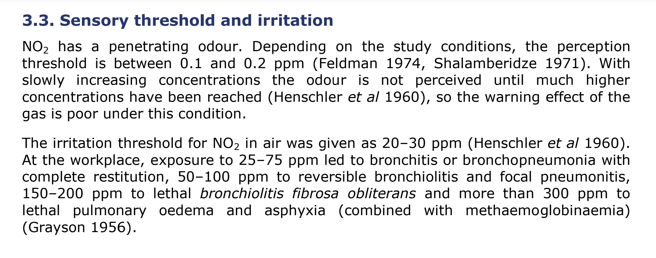 Note on attached image that the sensory threshold may be as low as .1 ppm, but also note that in cases of slowly raised concentrations ABILITY TO SENSE LOWER BUT STILL DAMAGING LEVELS IS LOST. The max for a 4 hour exposure may be set at .5ppm, but you can't judge that by your sense of smell.