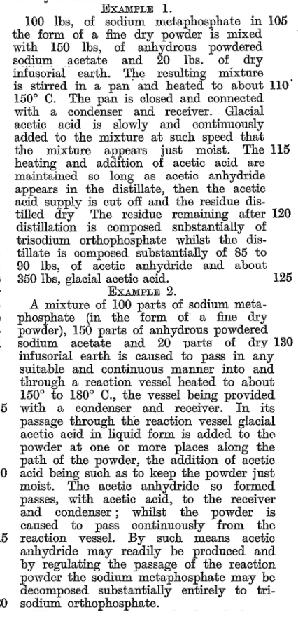 The patent from 1927 claims "the production of acetic anhydride from a mixture of sodium metaphosphate, anhydrous sodium acetate, and infusorial earth