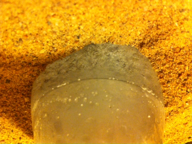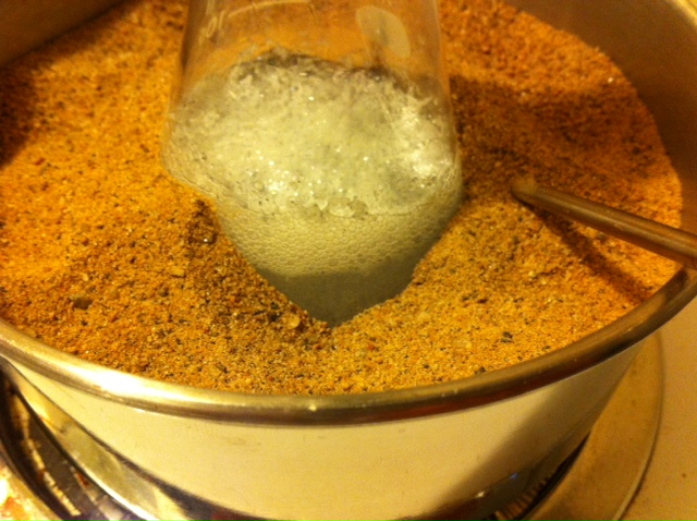 The first experiment I did was using the same setup as Pok, flask in a sandbath at 220c, for four hours. The oil was heated and at first there was
