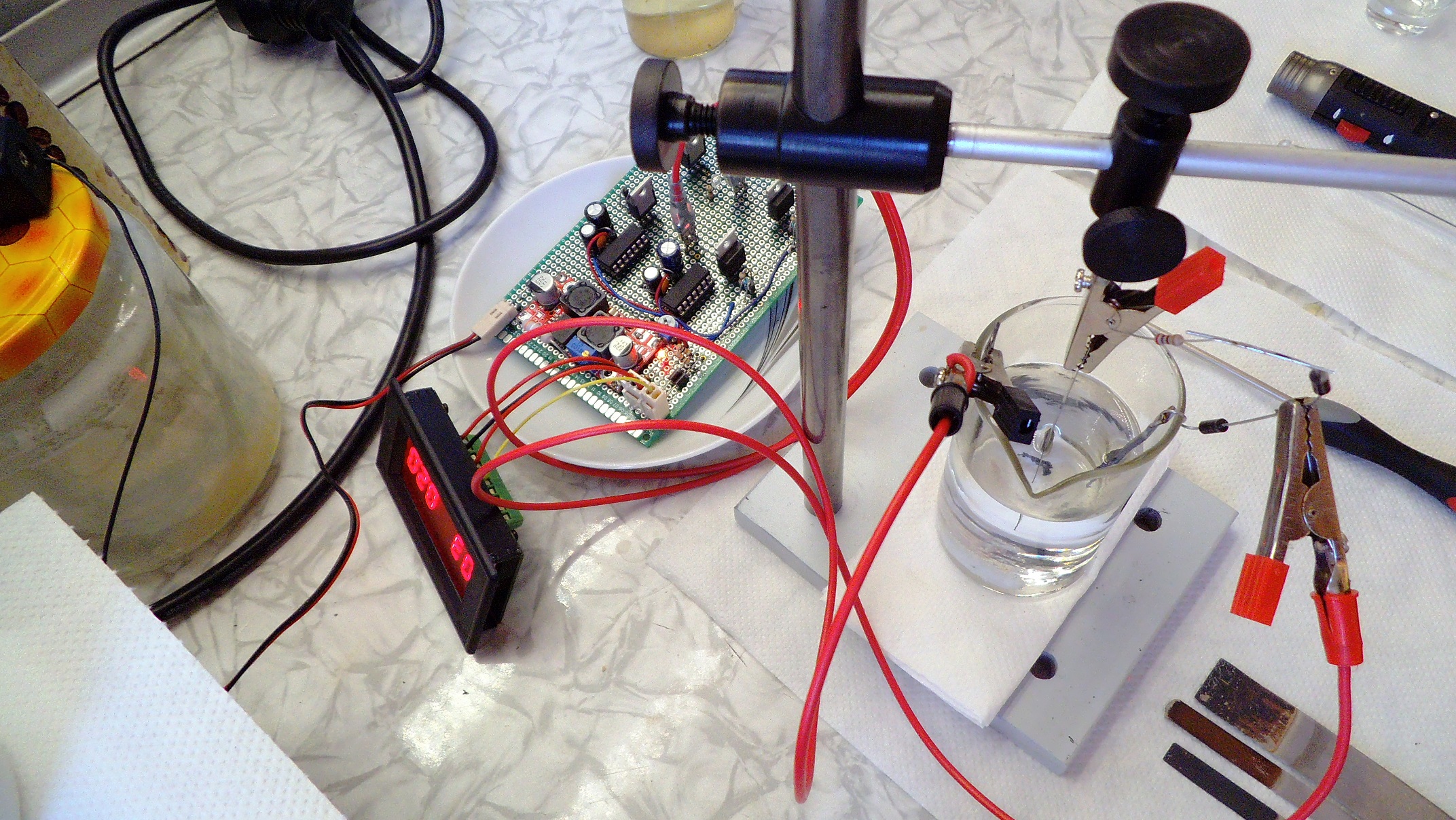 The sample from last post happily bubbling away in a small perchlorate cell (KClO3 solution):