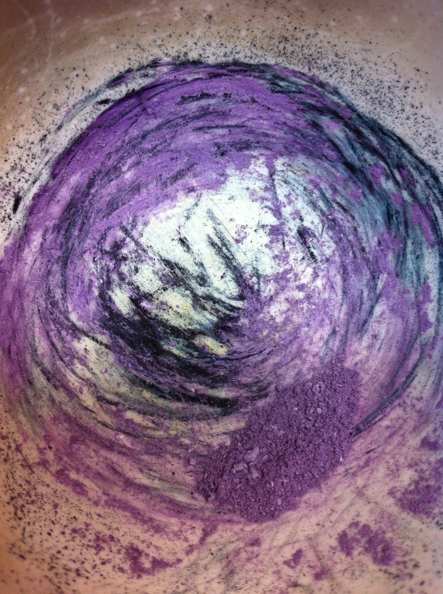 Ground the components in a mortar, that is how it looked after some minutes. It started to turn dark green where the KOH powder took up water.