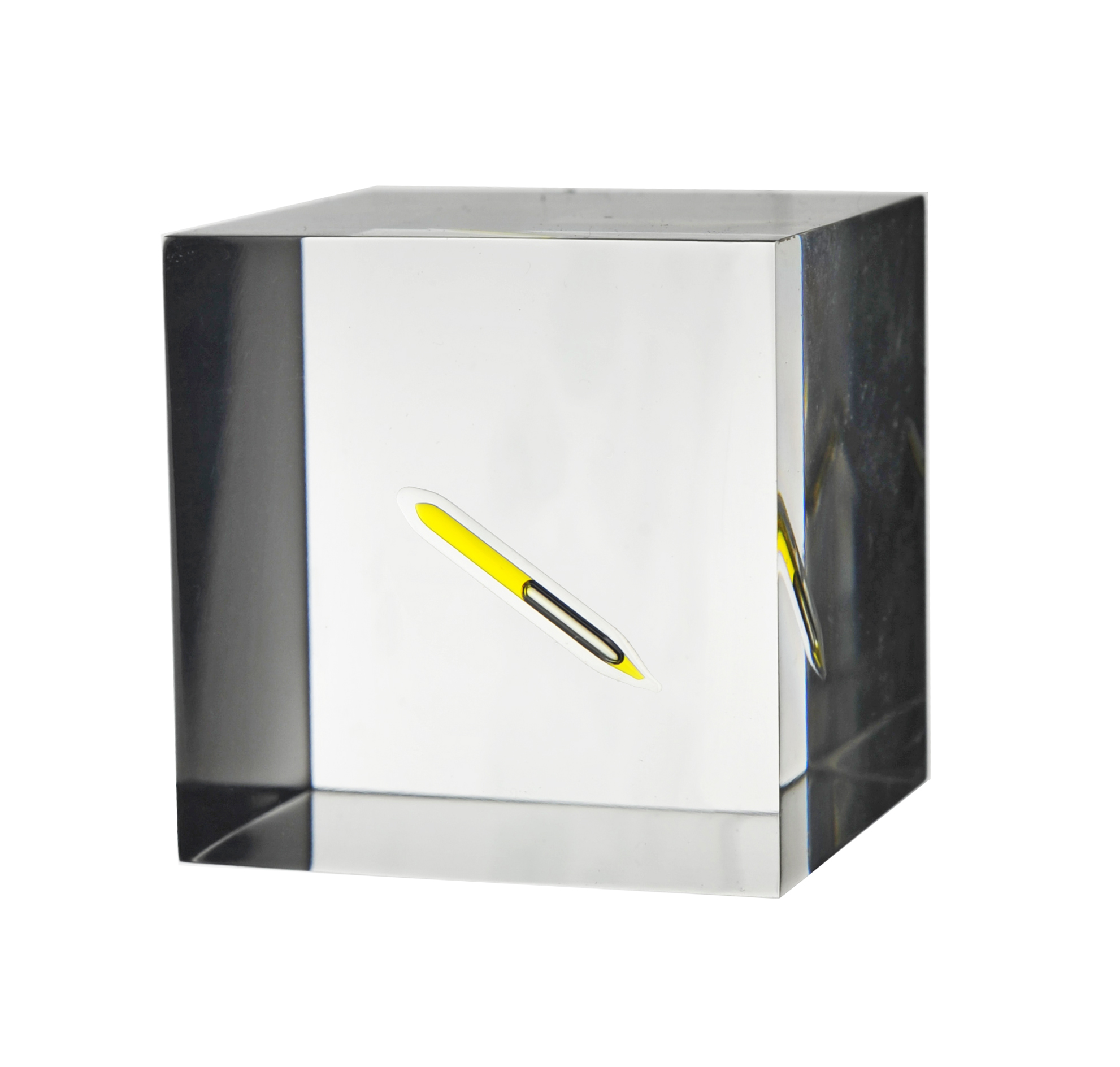 Another poster requested I upload a photo of my sample of pressurized chlorine. Just a little ampule cast inside a much larger cube of high quality