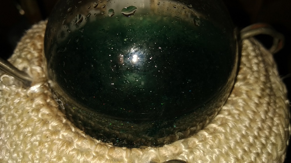 A significant amount of dark green/blue oil remained in the sump after distillation, which solidified fairly quickly upon cooling. Guess this will