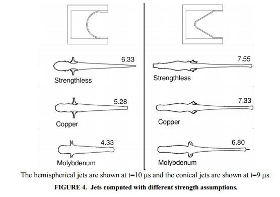 that the conical liner reaches at least 3 -4 Km/s faster jet velocity than the hemispherical liner.
