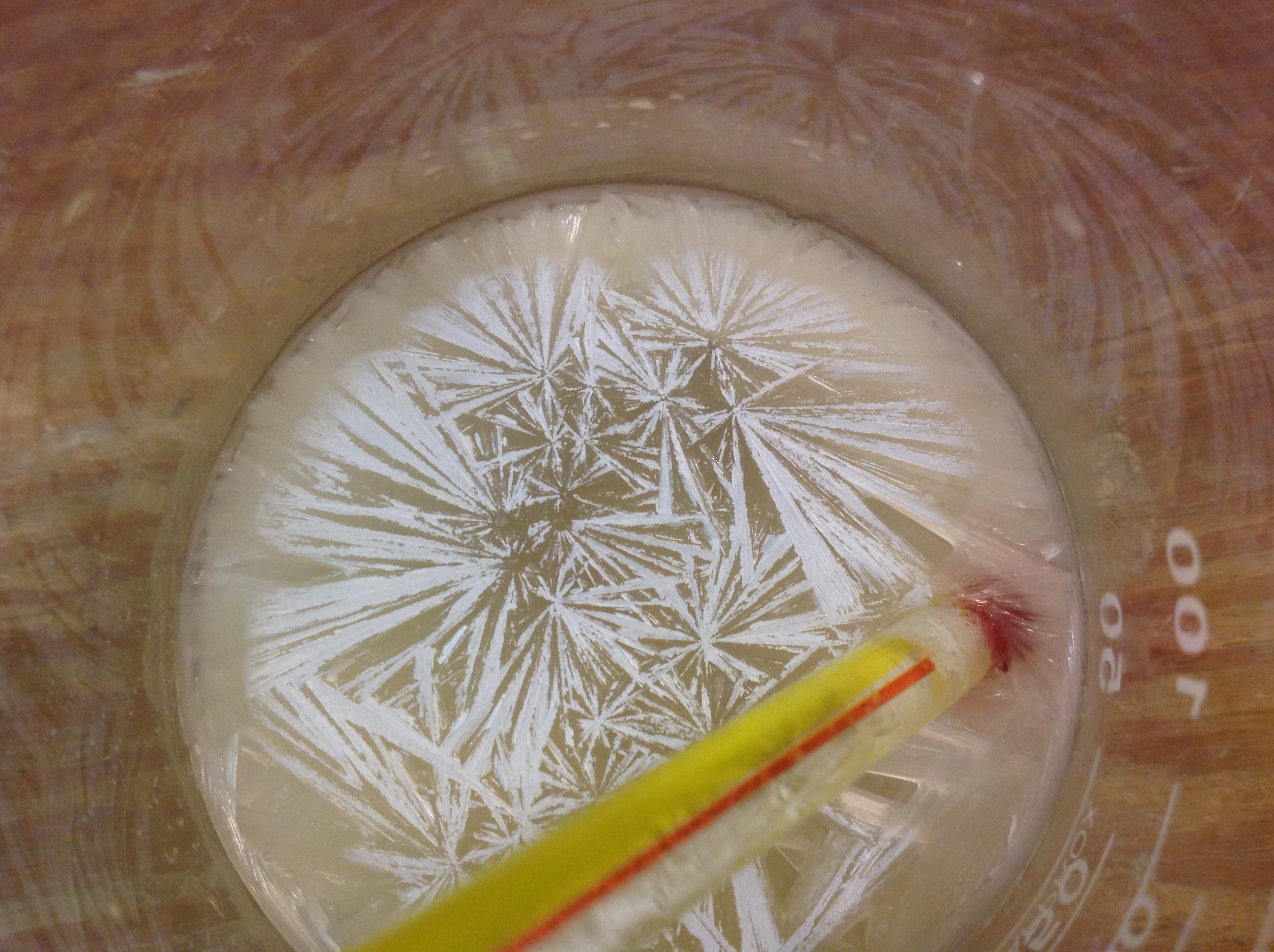 Accidental 'hot ice'! Cool looking crystals after boiling down sodium acetate solution. Brown/yellow(ish) color is from organic impurities, thanks to