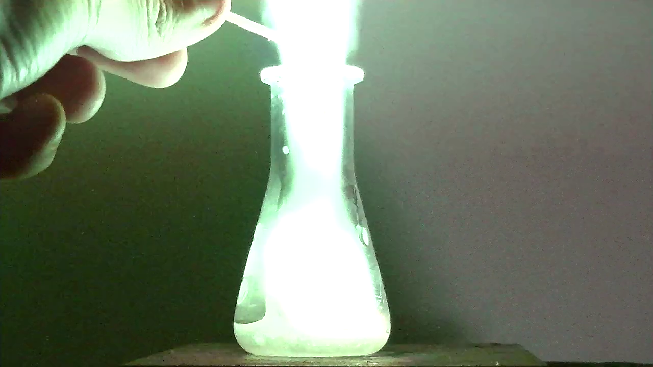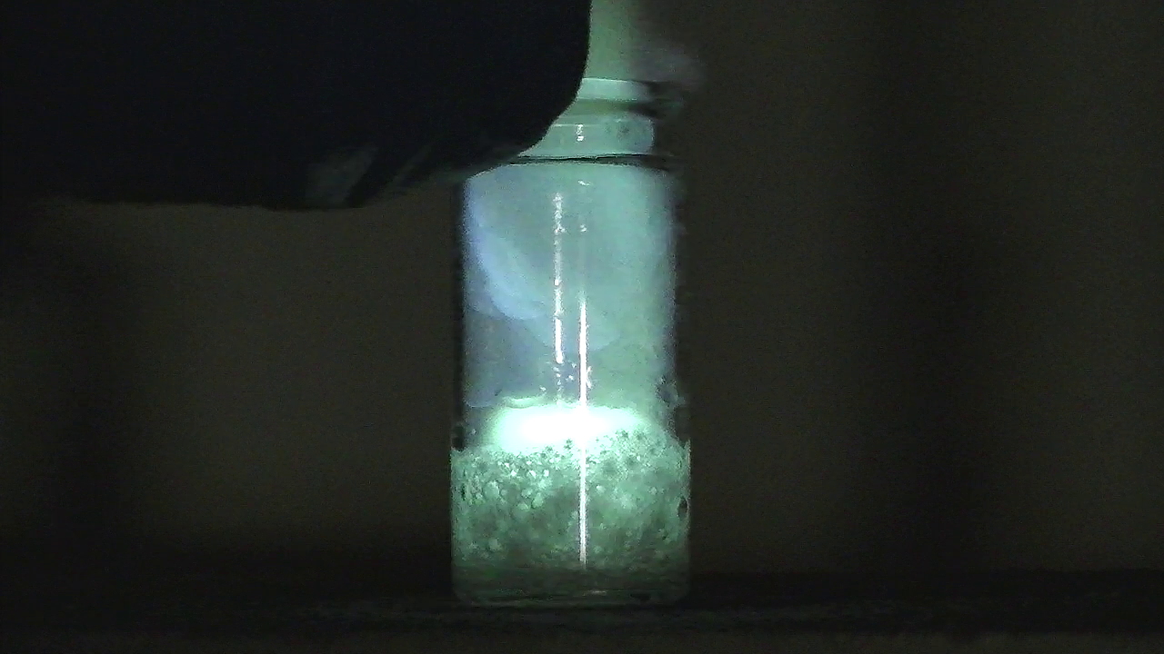 the metal) and afterwards shows a green-blue gas (some frames later this gas catches fire and the whole thing starts to glow).