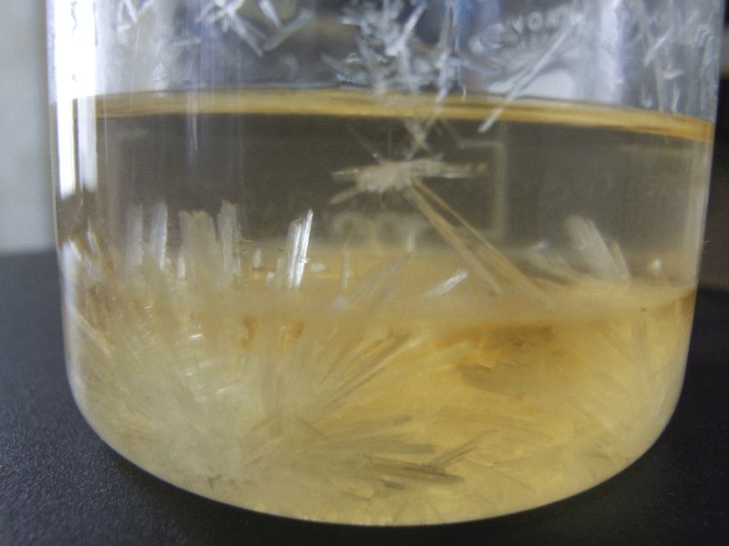 The liquid separated into two layers upon cooling and after a few days in the cold crystals started to grow.