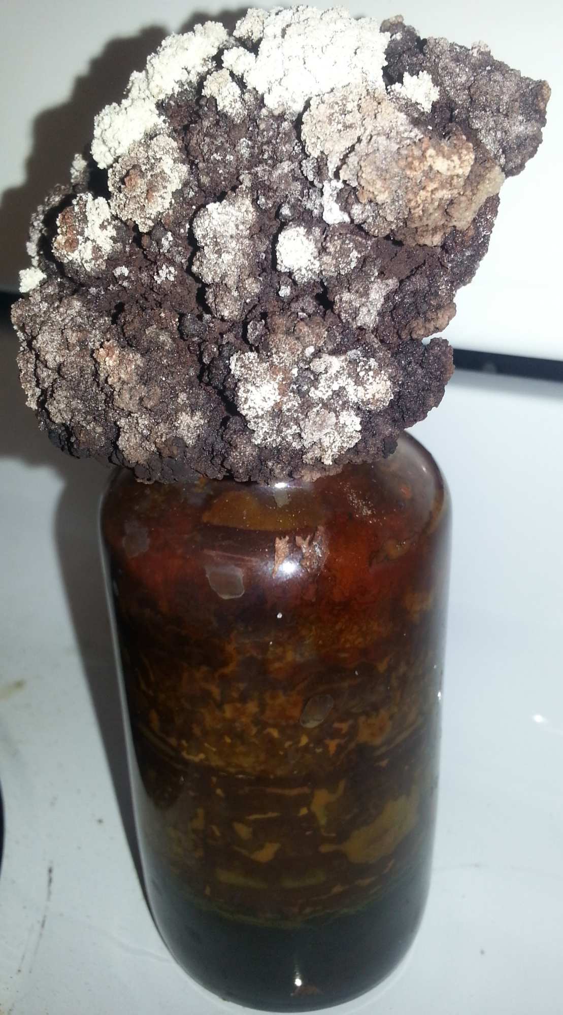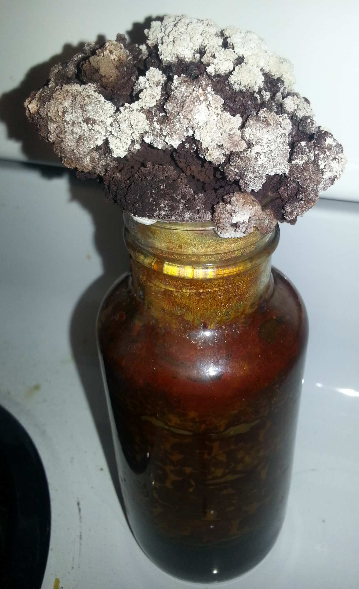 and about 2" of liquid above it and it was allowed to sit out for about 2 months. About 2 weeks in I noticed a little "puff" on the lip of the bottle