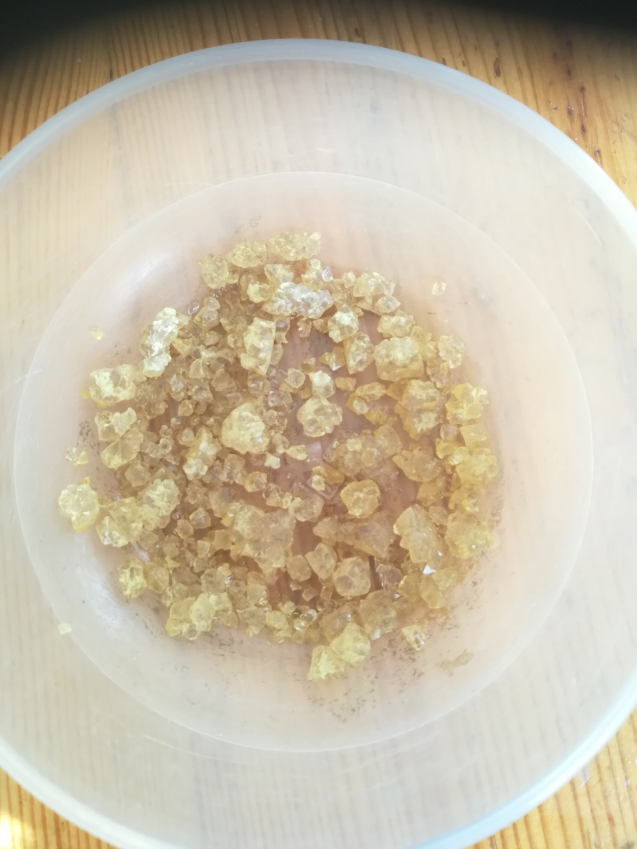 Crude cinnamic acid, basically solidified blobs of acid mixed with cinnamaldehyde, with crystals of pure acid growing from them.