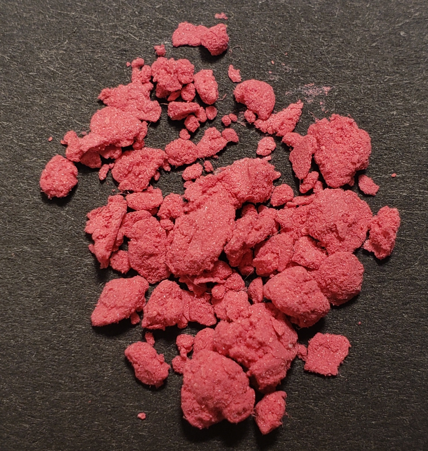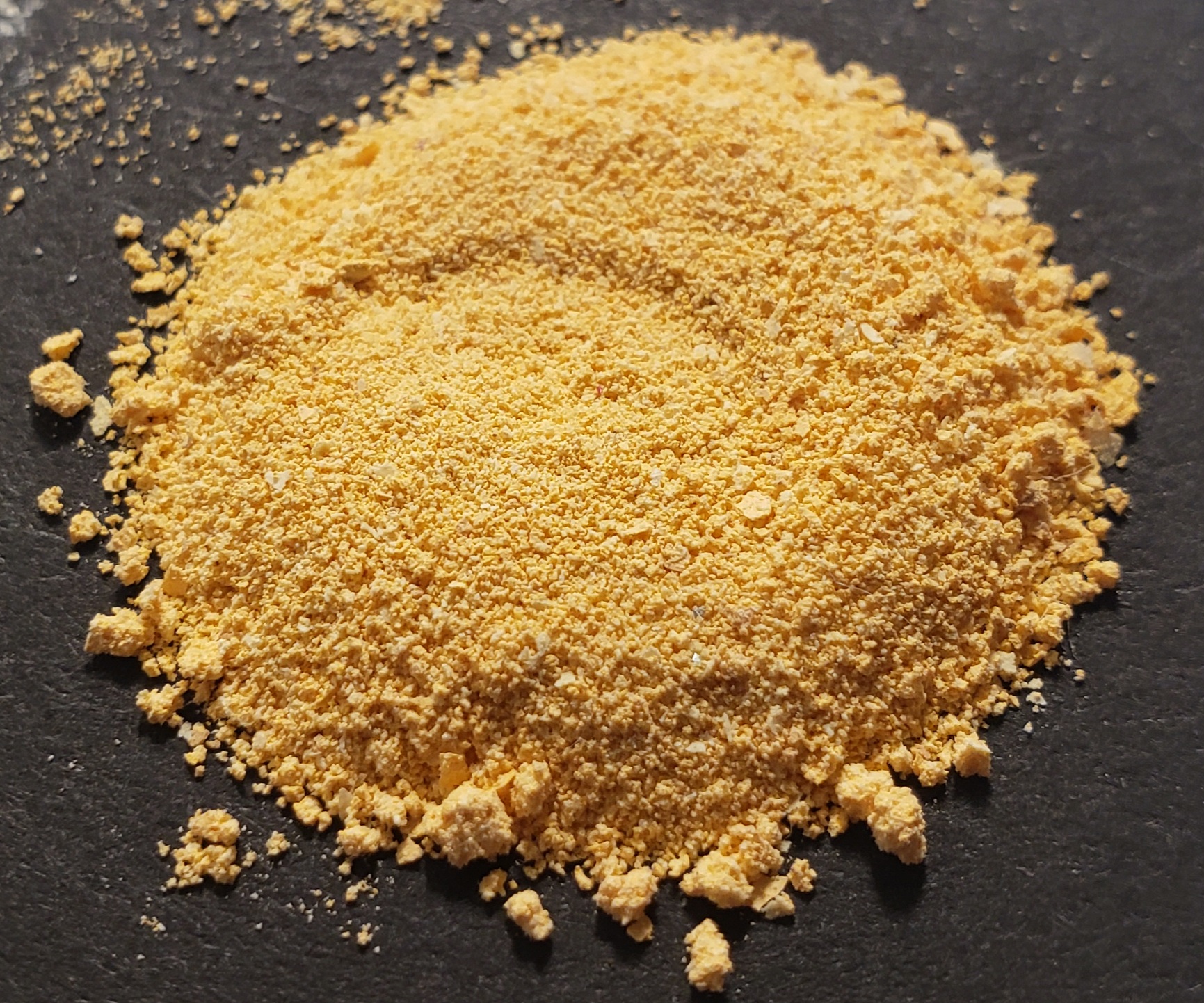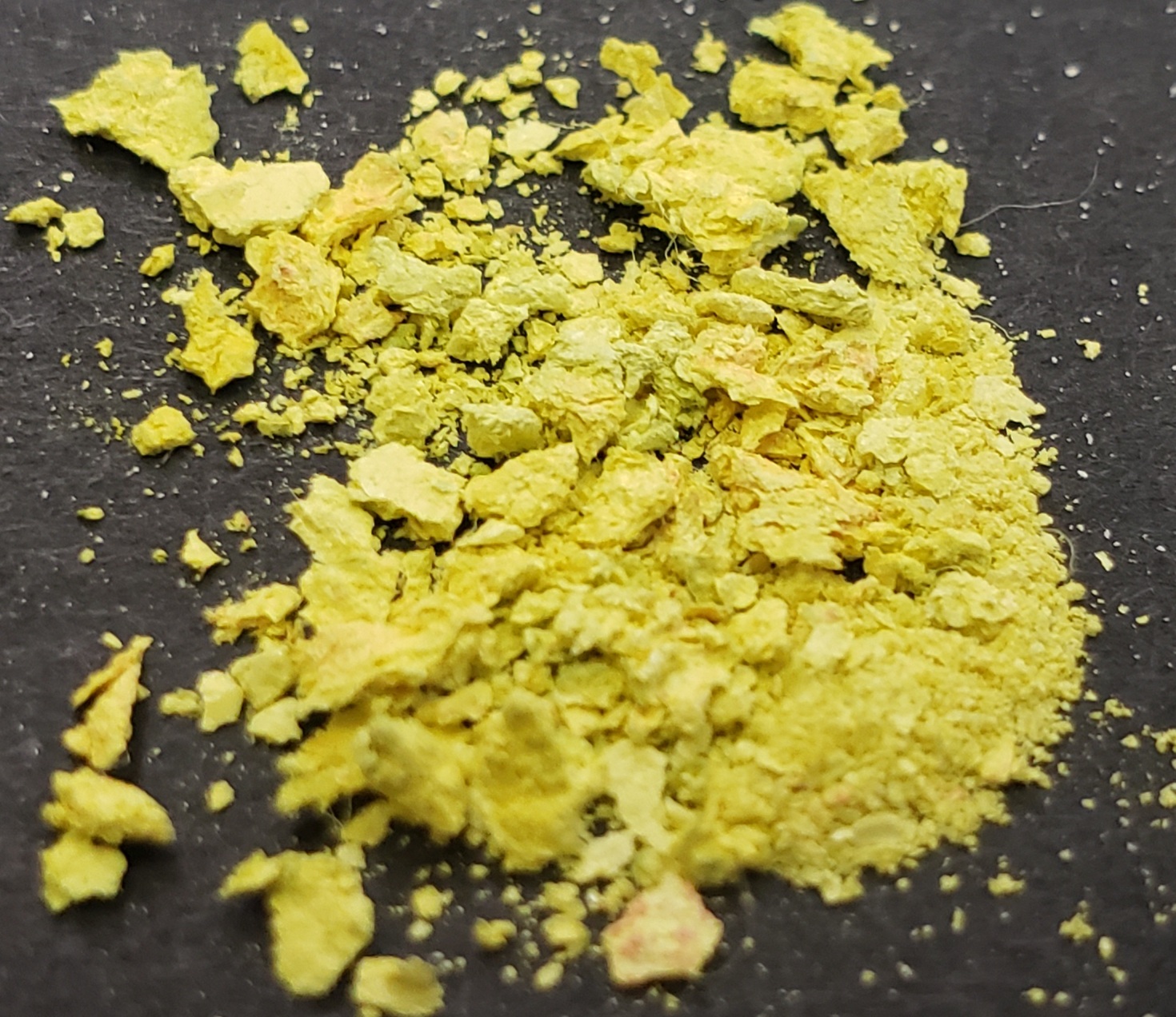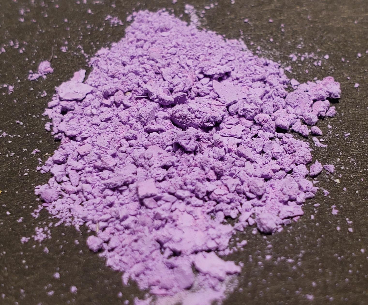 A picture of the dried powder in a watch glass. The material has a beautiful bright color, it really looks like it is in the picture with a deeply