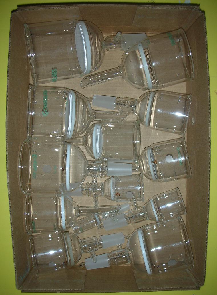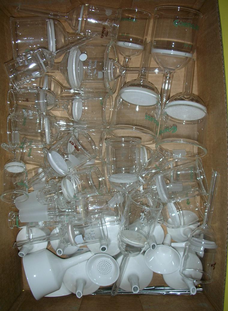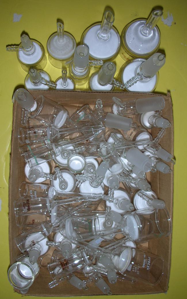Here are some of the fritted funnels I have left. The sizes range from 15 ml to 350 ml (volume of the top part). I have simple funnels, as well as 14/20 and 24/40 jointed ones. The frits are F, M and C. I have most frit porosity types in most sizes and styles, but not all. These photos DO NOT include the larger or longer ones, including the ones meant for chromatography, which I am still trying to organize. I have several more boxes of these available, some of those are dirtier or larger. I also have some smaller buchners, glass frits and other odd pieces, most are listed in the spreadsheet.