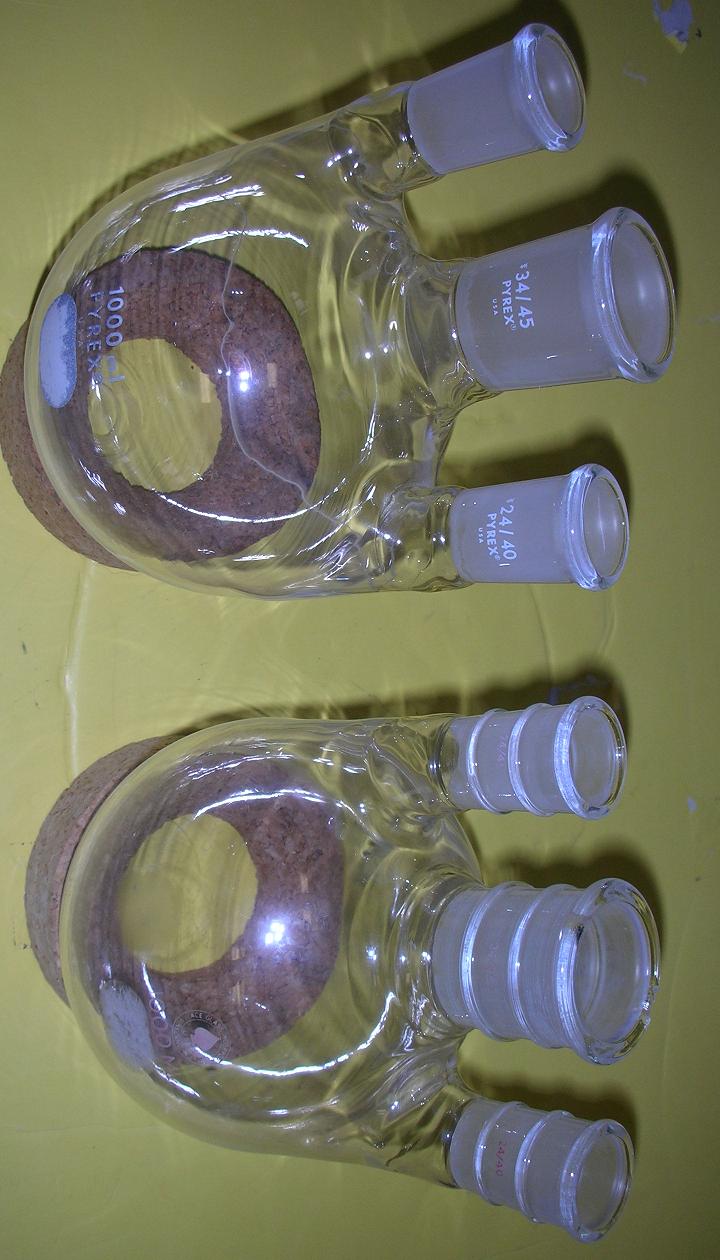a) 2 1000 ml 3 necks with center 34/45 joints and side 24/40 joints. Both are worn a bit, the right one has a chip on the center joint. Right one is $20 left one is $15.