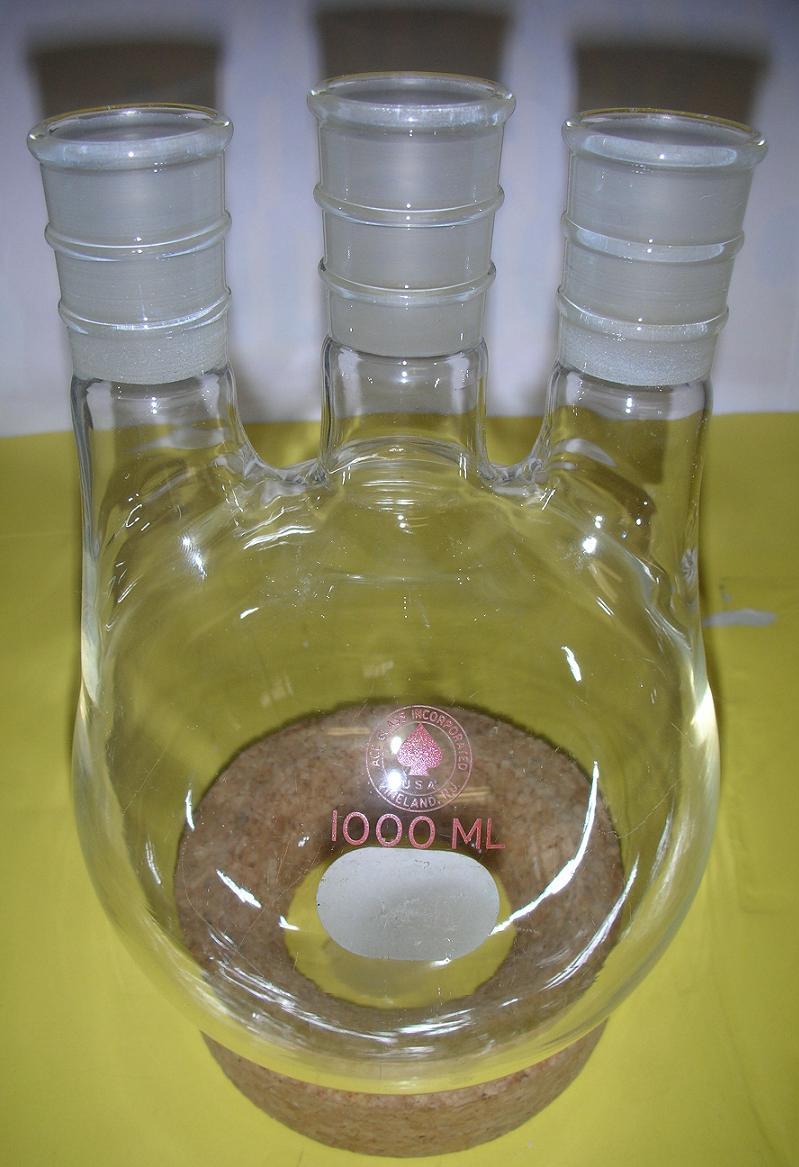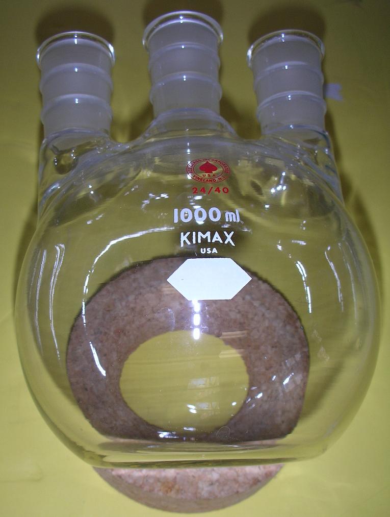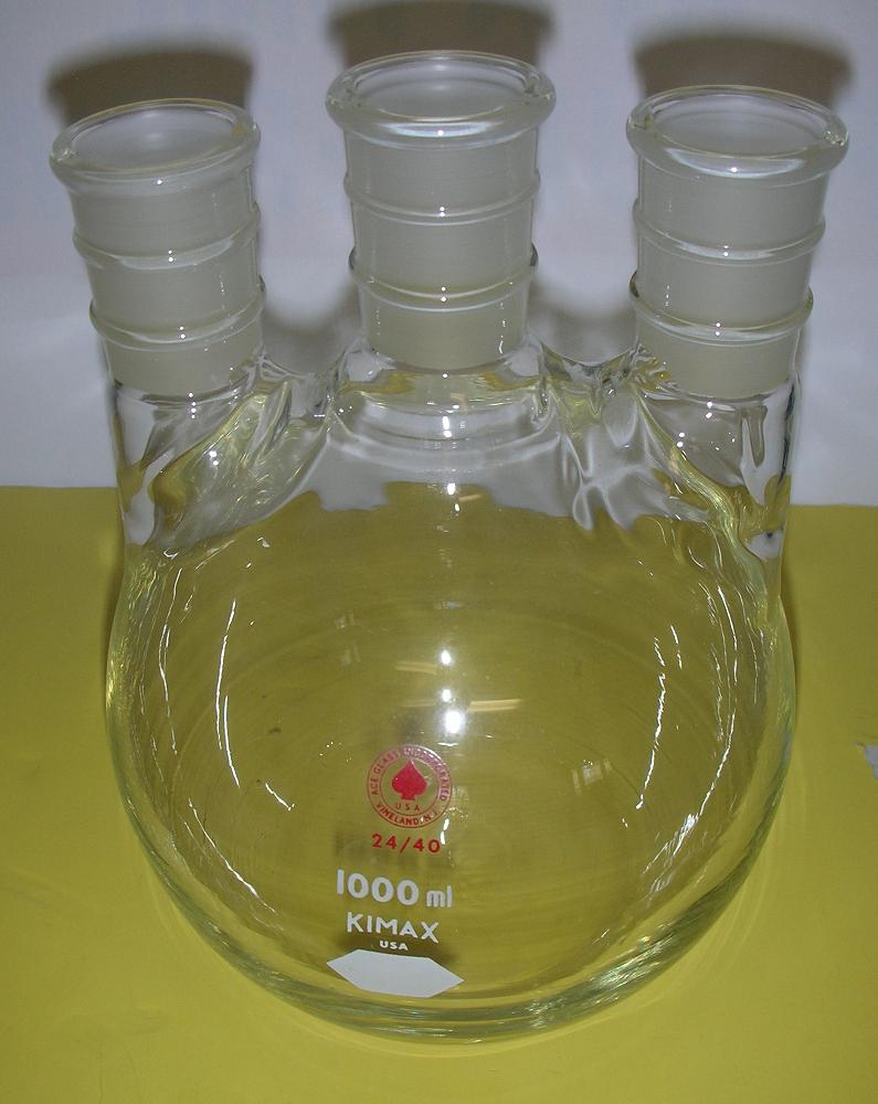 e) 1000 ml 3 neck with all 24/40 joints, vertical joints. In good shape, last 1L 3 neck with all 2/40 joints. Ace glass $20