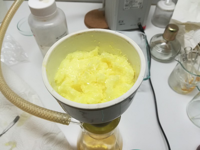but only upon final cooling. You will be left with some orange-red liquid, but the lions share will solidify. This is the best yielding reaction