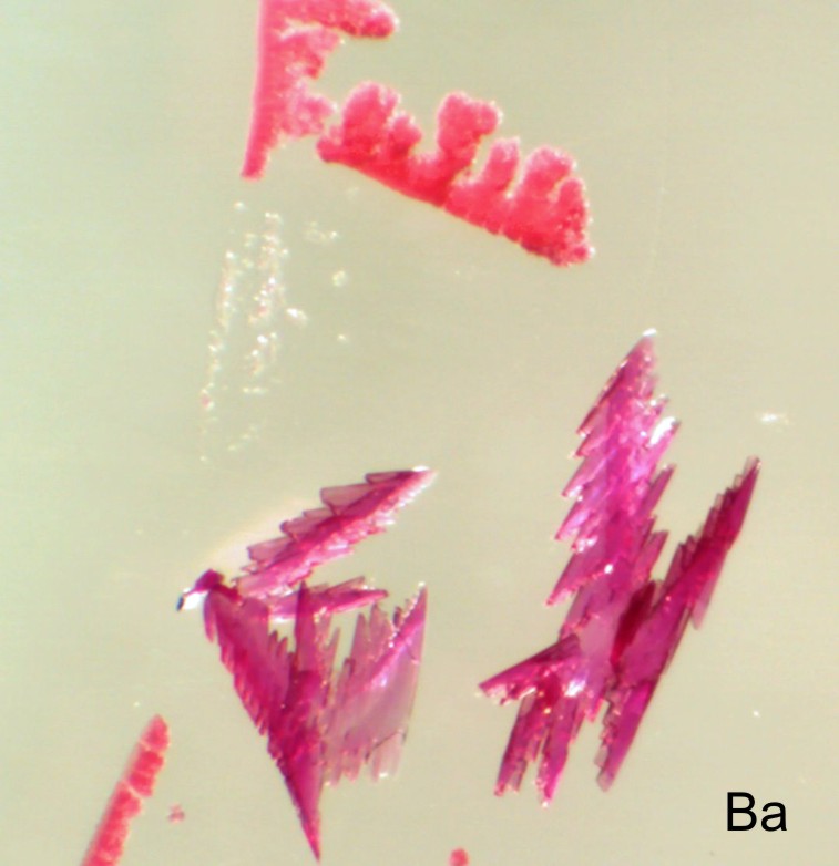 Strontium forms crimson blades and small brick red balls in the same fashion.