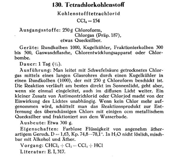 Attached is the german prep for CCl4 from CHCl3 and chlorine.