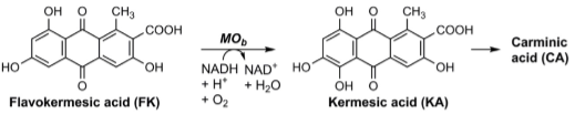 Carminic acid can (theoretically, at least) be synthesized starting from flavokermesic acid (FKA in the paper), hydroxylating to yield kermesic acid, and then glycosylating to yield carminic acid, and then I gather I would need to precipitate the carmine pigment out with an aluminum salt.
