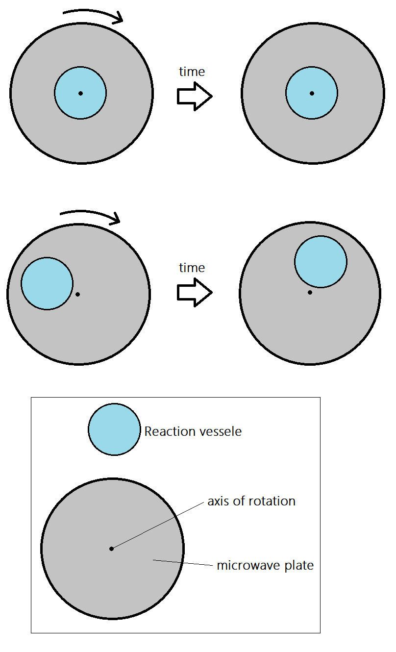 If the reaction vessel is in the middle of the rotating plate, than the axis of rotation of the vessel will be in the middle of the vessel. This allow