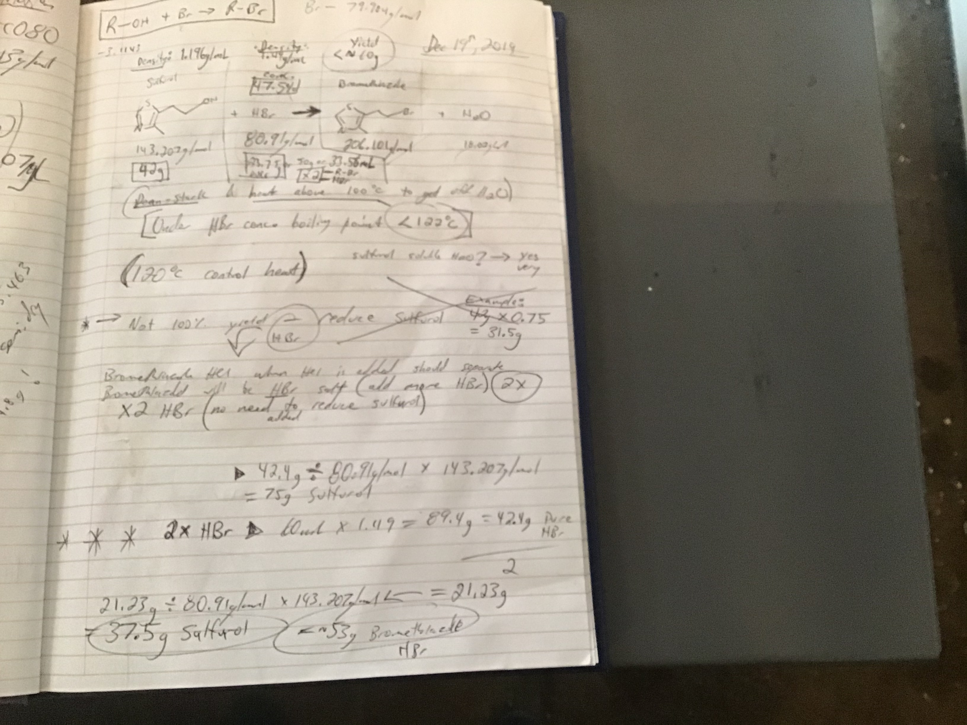 From 21.23g HBr / 80.91g/mol HBr x 1/1 x 143.207g/mol sulfurol = 37.5g sulfurol required. I added twice the amount of HBr as it makes the salt and you require extra for the halogenation. I ended up heating the mixture for two hours and the temperature settles at 110c when heating.