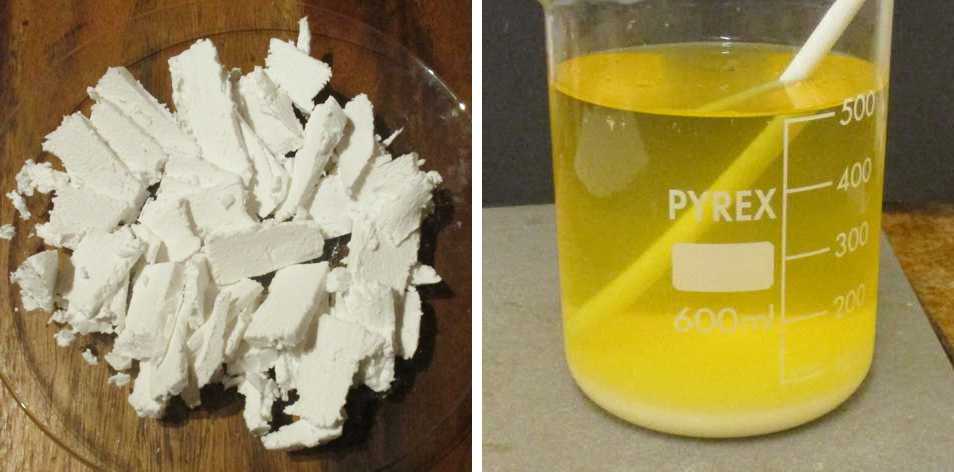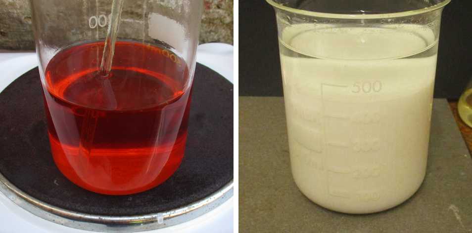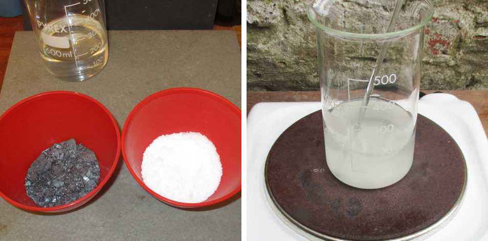 The ingredients iodine and NaClO3 (L) Sodium chlorate dissolving (R)