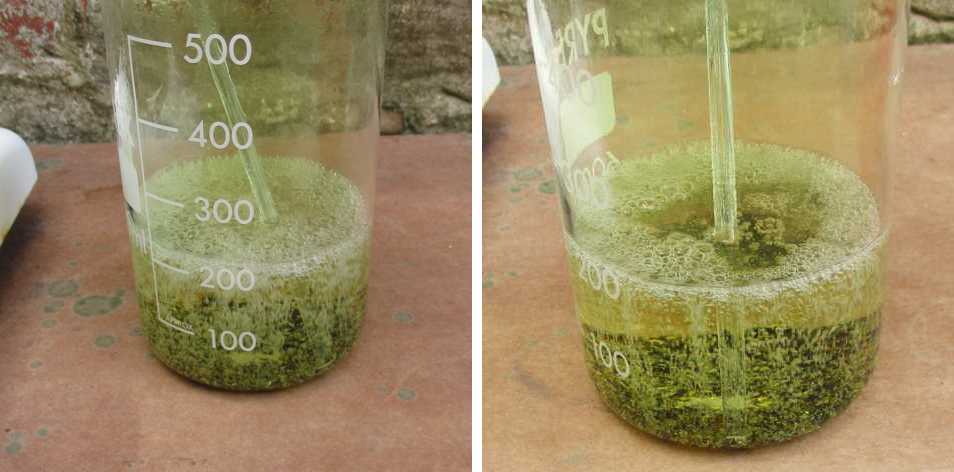 The initial vigorous reaction (L) The reaction subsided- faint yellow vapour (R)