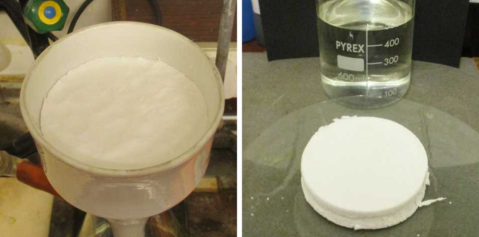 Sodium iodate H2O cake in the filter (L) Filter cake ready to dry and the clear filtrate (R)