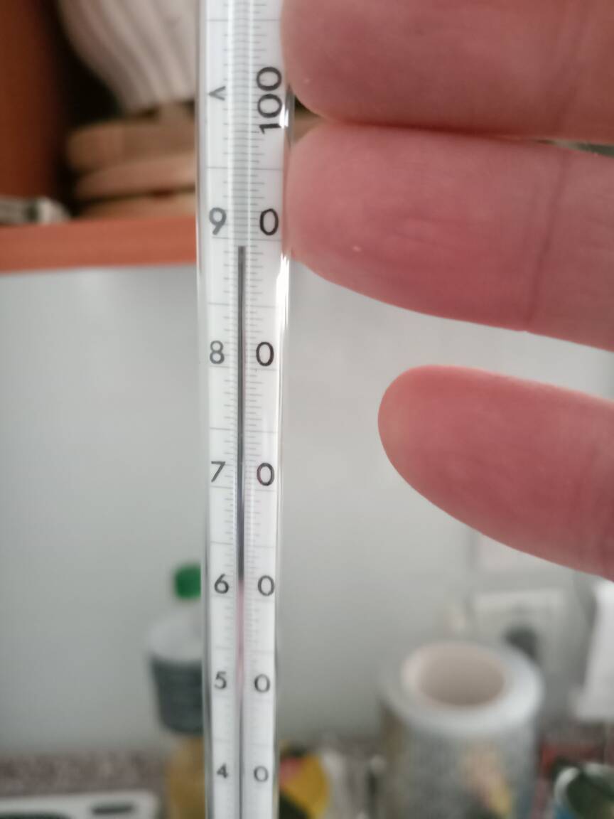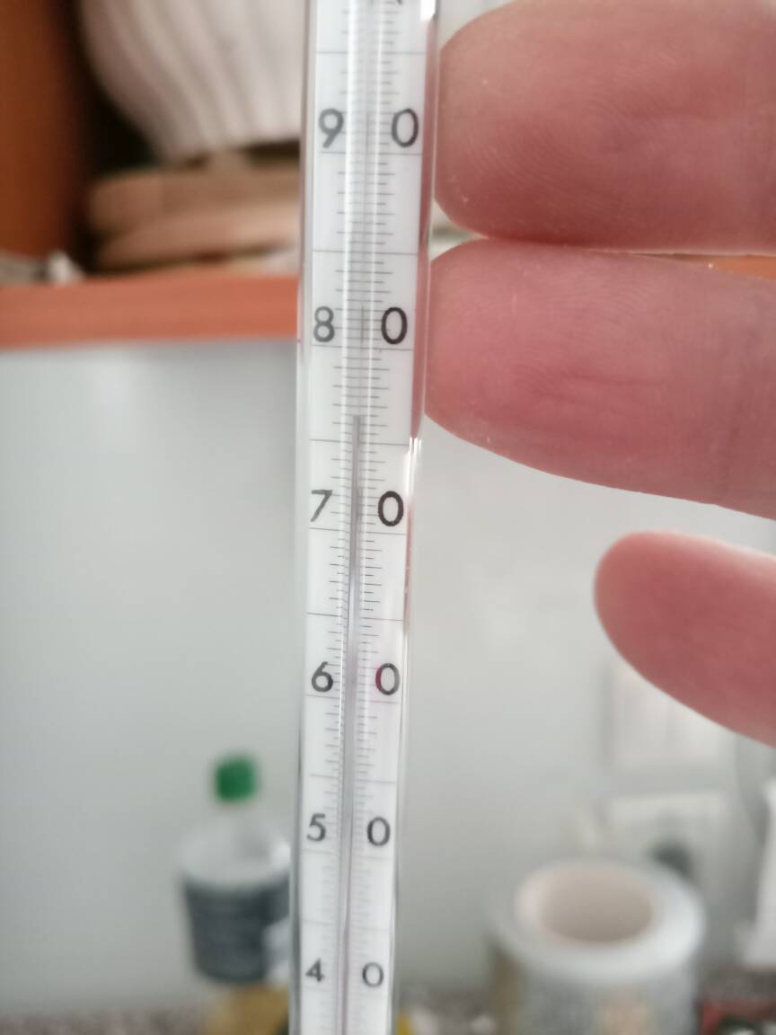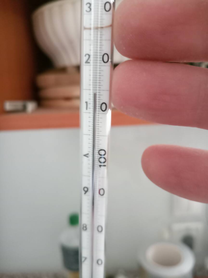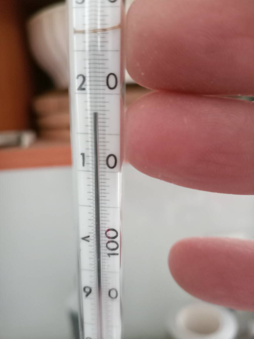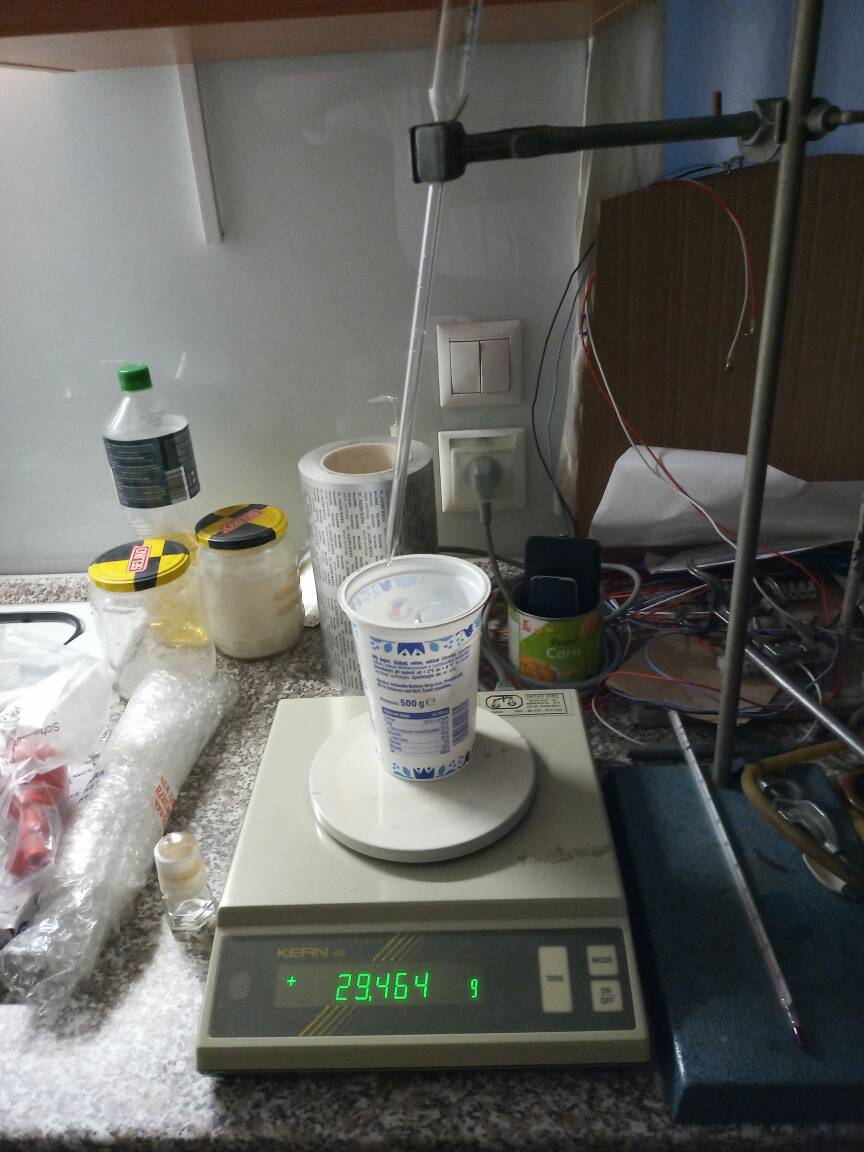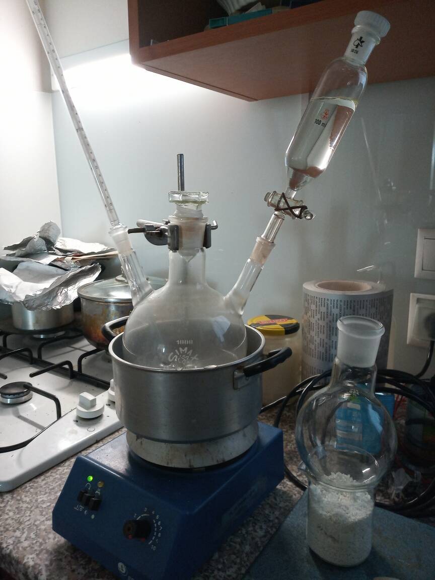 During the reaction (which is slightly exothermic) the 15 C cold water bath was refreshed every time it reached 20 C by draining out all water and replacing with fresh 15 C tap water. Later was also tried draining part of the water and addition of snow to keep the bath temperature in range 15-20 C which also worked well.
