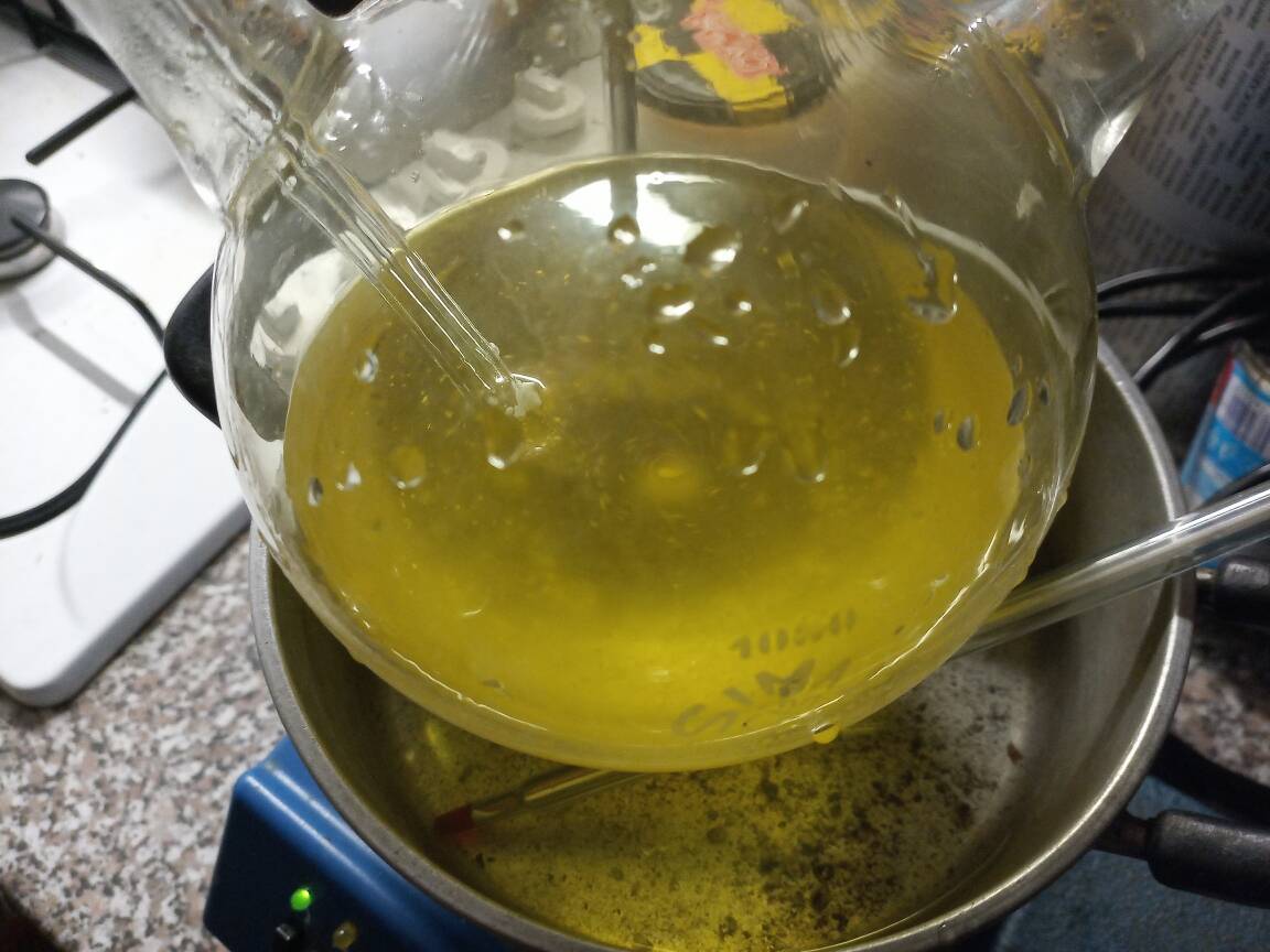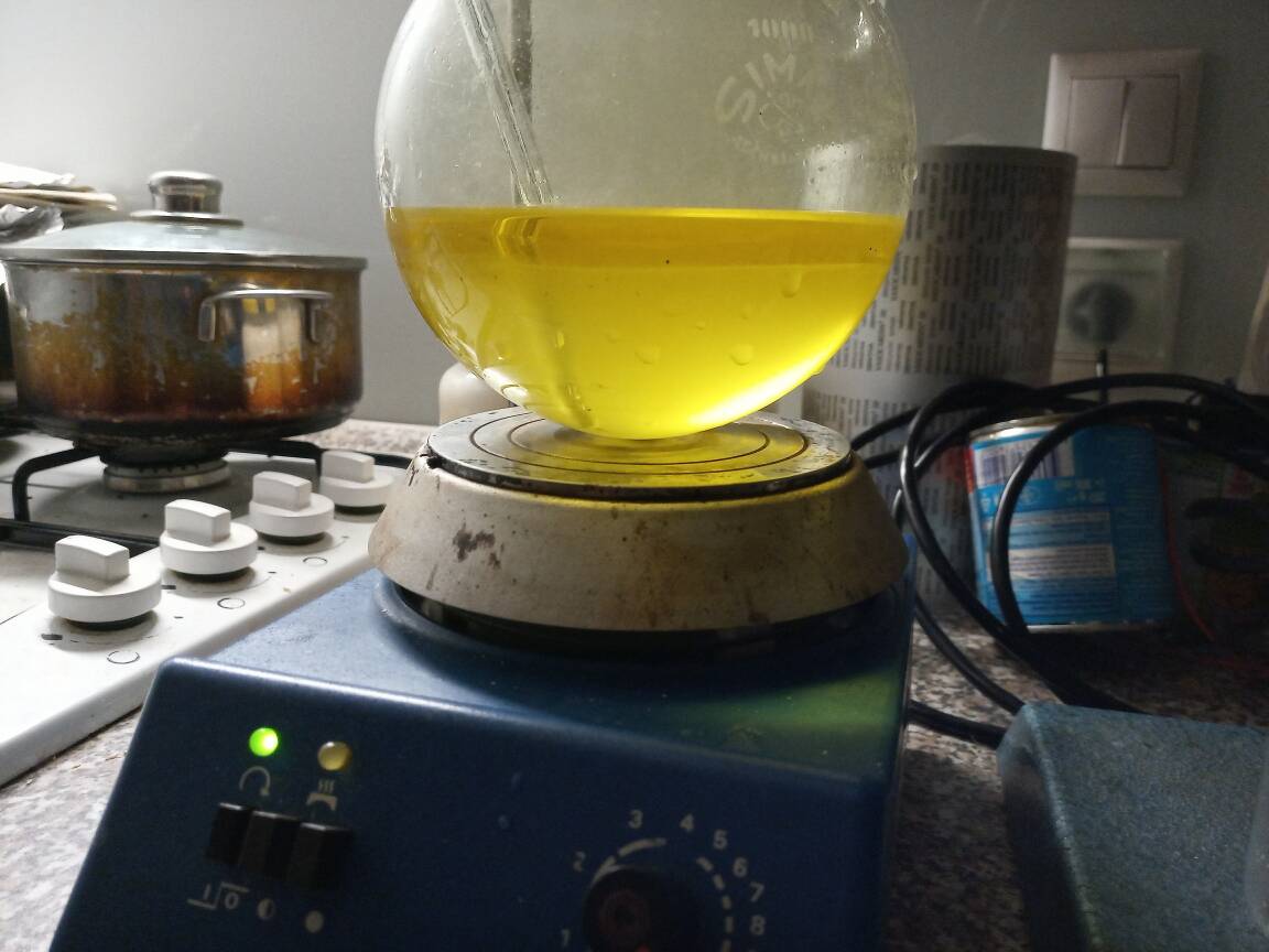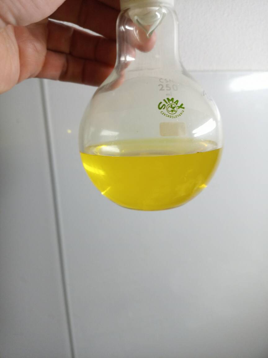 Then I let the crude product to sit over CaCO3 for 1 month and its color changed from yellow into colorless. I decanted it into clean 250 ml RBF, added a little of CaCO3 and performed simple distillation.