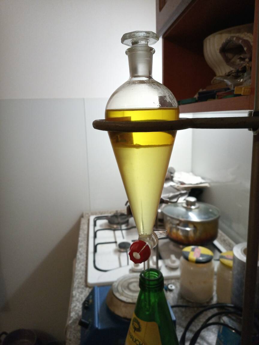 The mixture was transferred into separatory funnel, upper organic layer was separated and transferred into 250 cm3 flat bottom flask.
