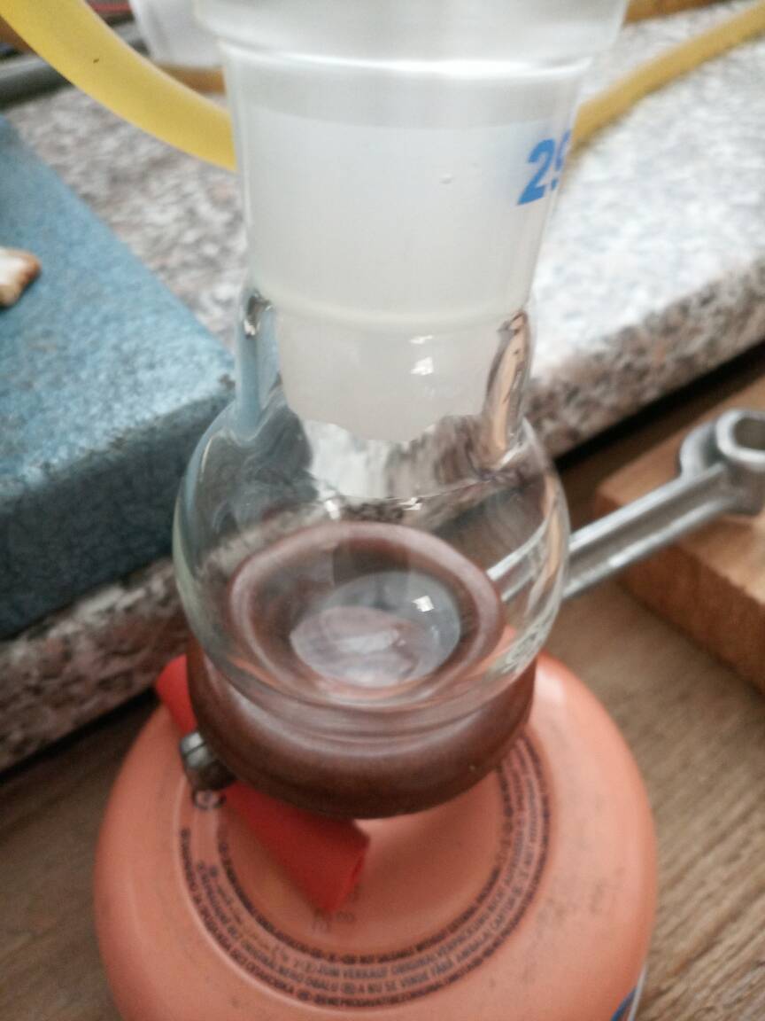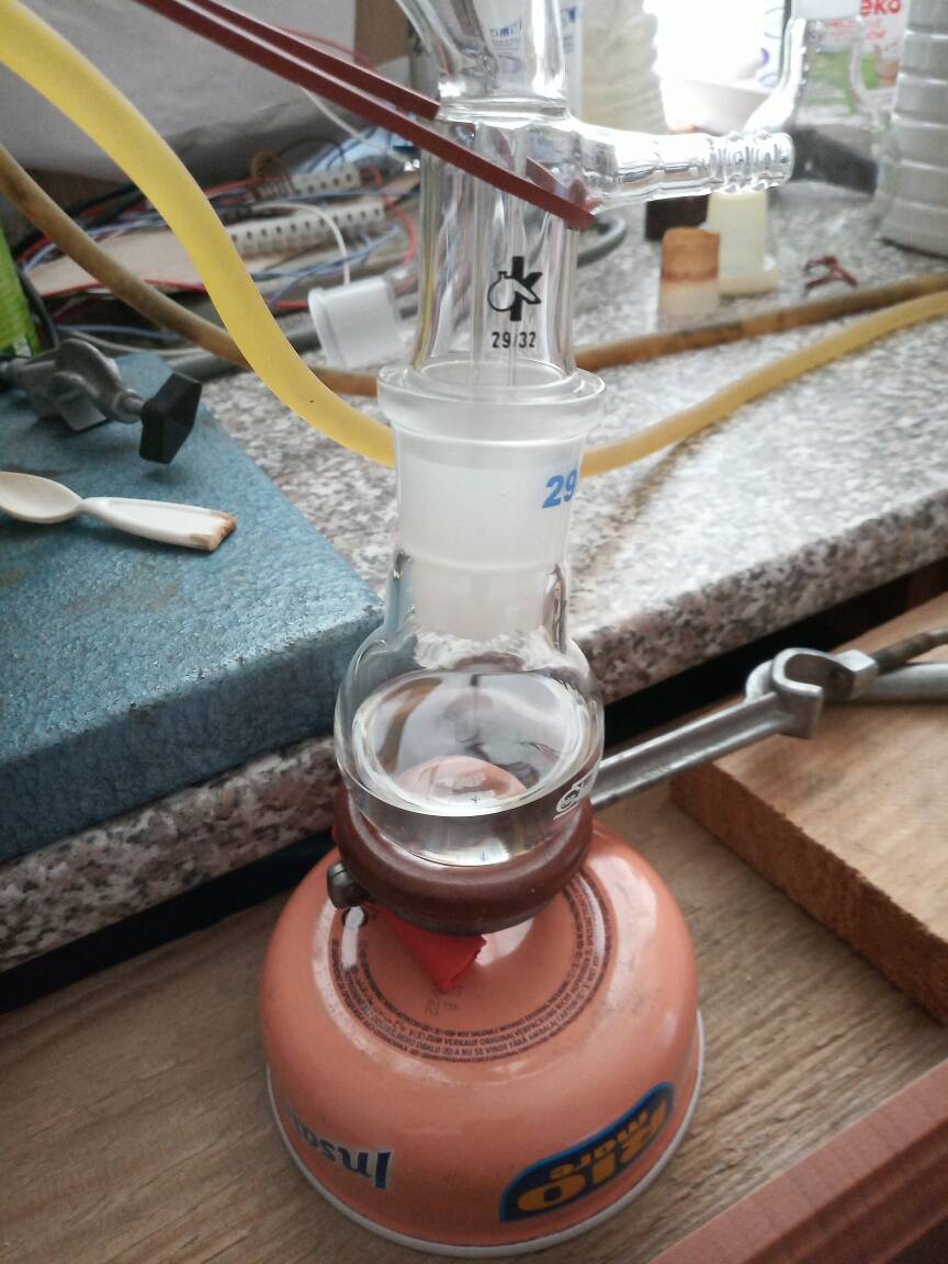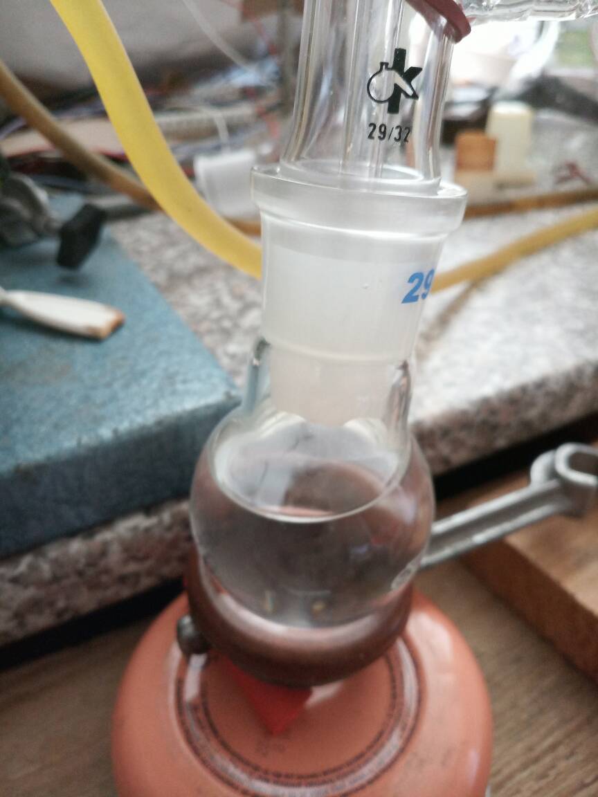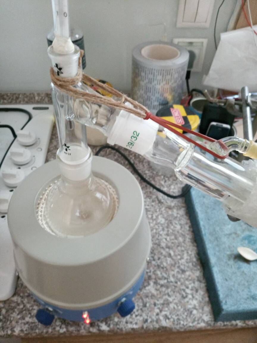 To the prepared distillate ~0,3 g of CaCO3 was added, botteled and set aside. In the meantime, additional synthesis was performed (with 20 g of acetone). Prepared liquid (treated with CaCO3/MgSO4) was mixed with that distillate, placed in 100 cm3 RBF, ~0,5 g of CaCO3 was added and set for distillation. Added carbonate made a little wonder during distillation- practically no "black death" is formed !