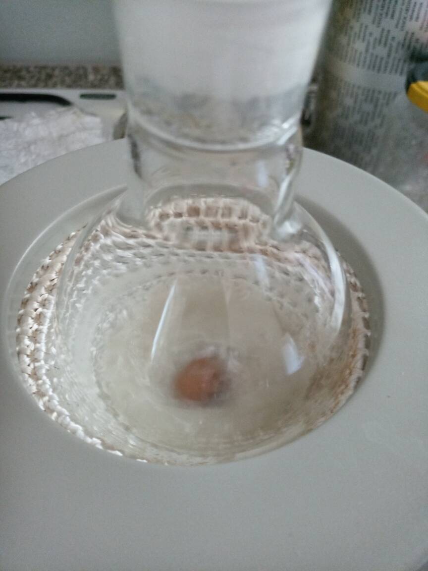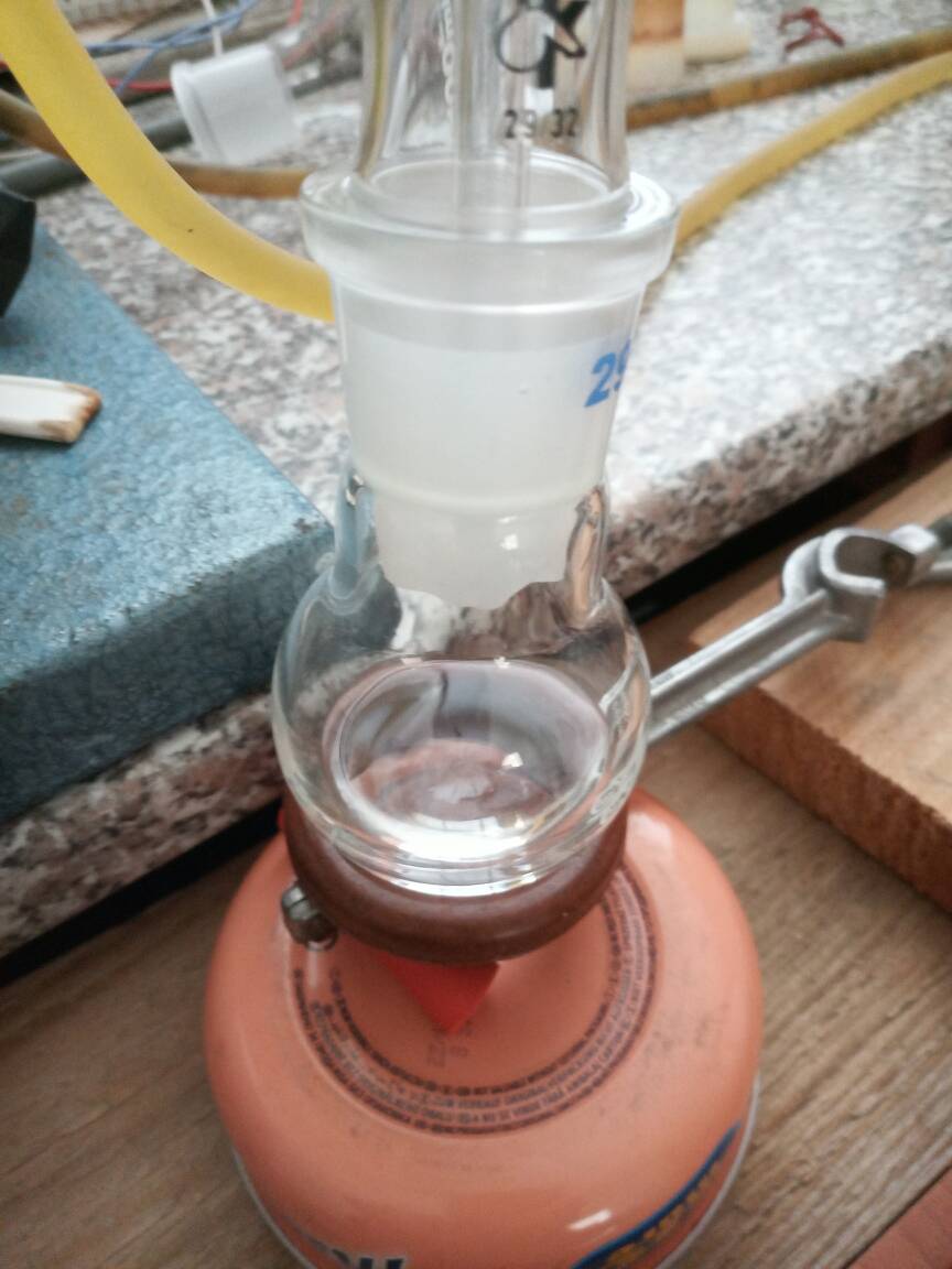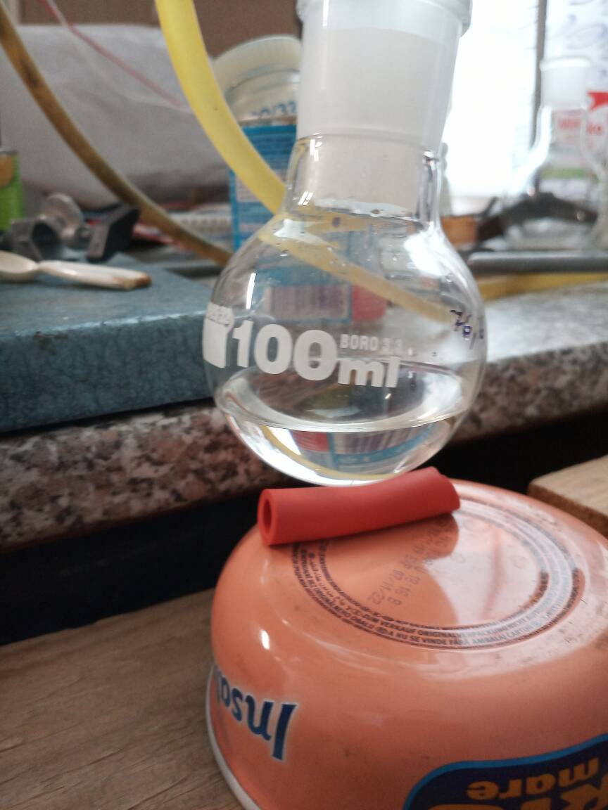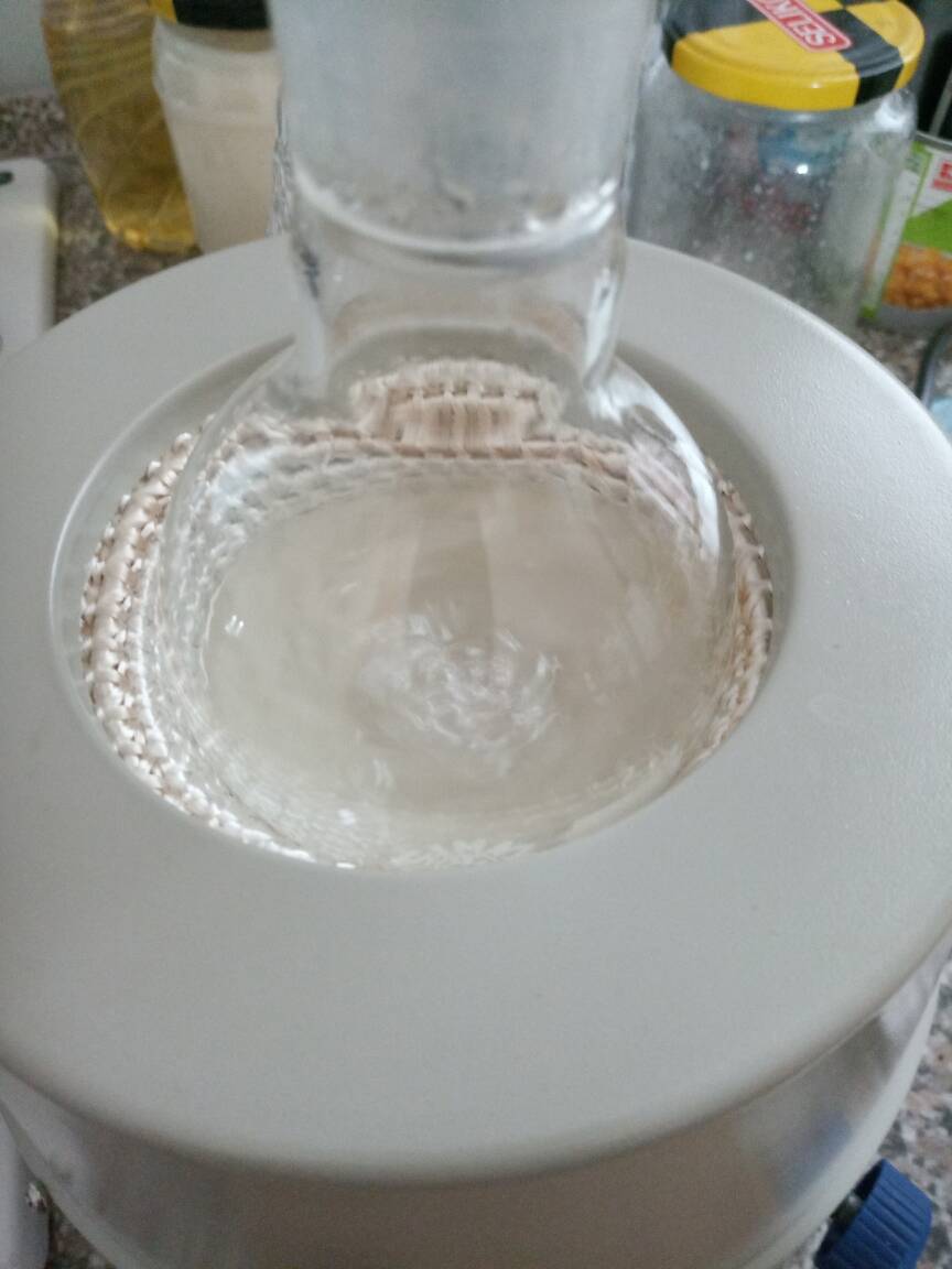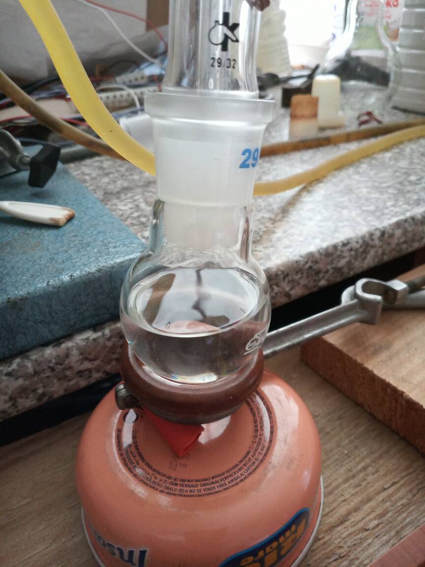 To the prepared distillate ~0,3 g of CaCO3 was added, botteled and set aside. In the meantime, additional synthesis was performed (with 20 g of acetone). Prepared liquid (treated with CaCO3/MgSO4) was mixed with that distillate, placed in 100 cm3 RBF, ~0,5 g of CaCO3 was added and set for distillation. Added carbonate made a little wonder during distillation- practically no "black death" is formed !