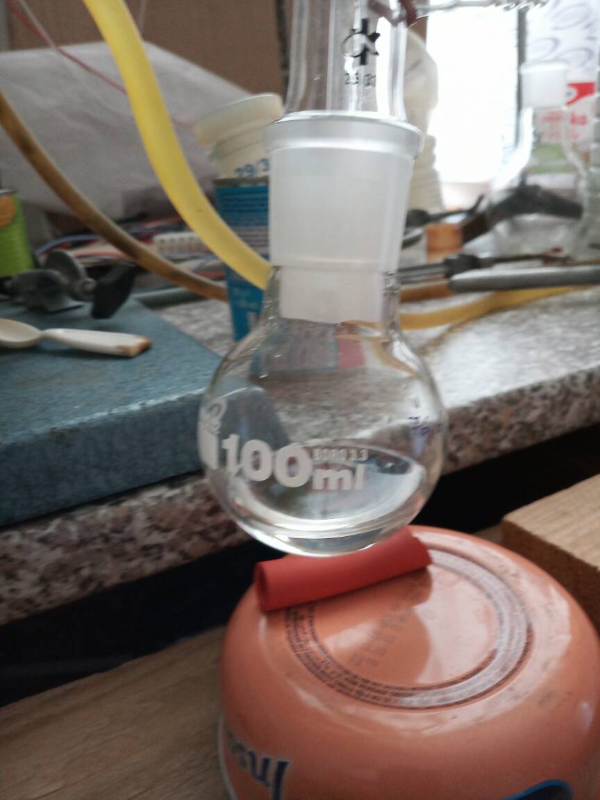 After drying, the liquid is ready for distillation. If someone has no time for it, another portion of CaCO3 (0,1 g or so) should be added to the liquid, then it can be stored for some longer time (best in brown glass bottle, storing temp. lower than 20 C). After ~7 days no traces of decomposition was (visibly) detected, the color of the liquid does not change at all.
