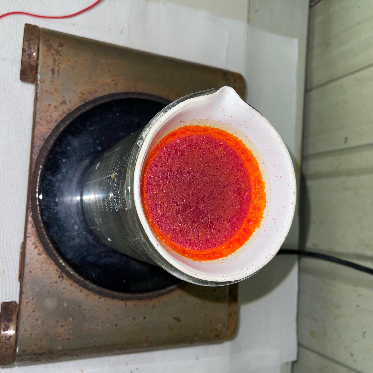- I heated the red filtrate on a steam bath. After many hours it was still liquid with a layer of crystals but the weight stopped decreasing.