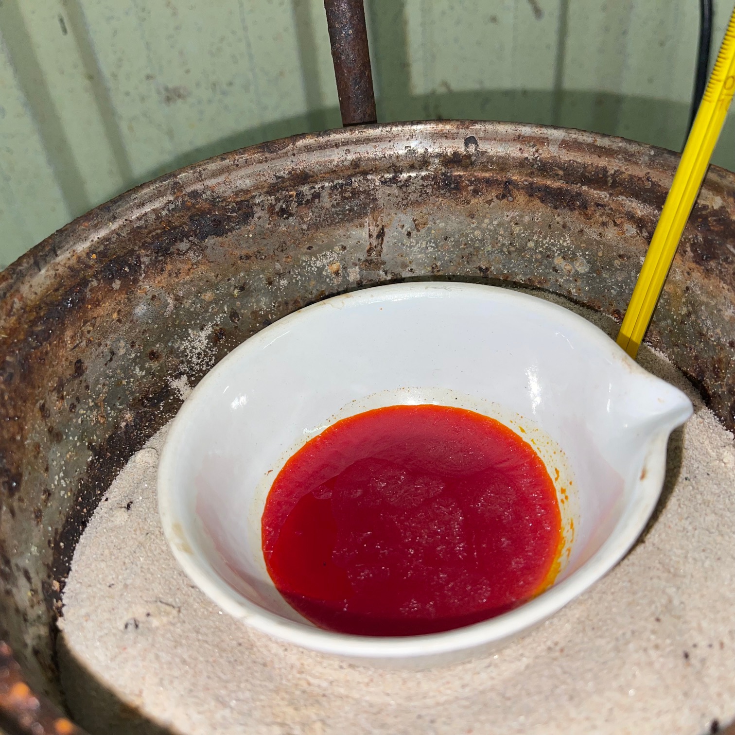 - I then heated it on a sand bath with sand temp around 150C, it remained a thick red wet paste without any obvious further drying or decomposition.