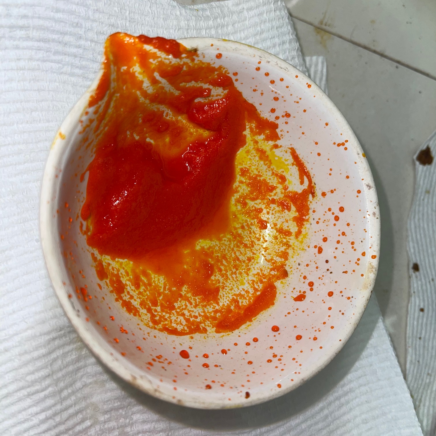 - When the layer of red liquid was poured off, a orange-red paste remains.