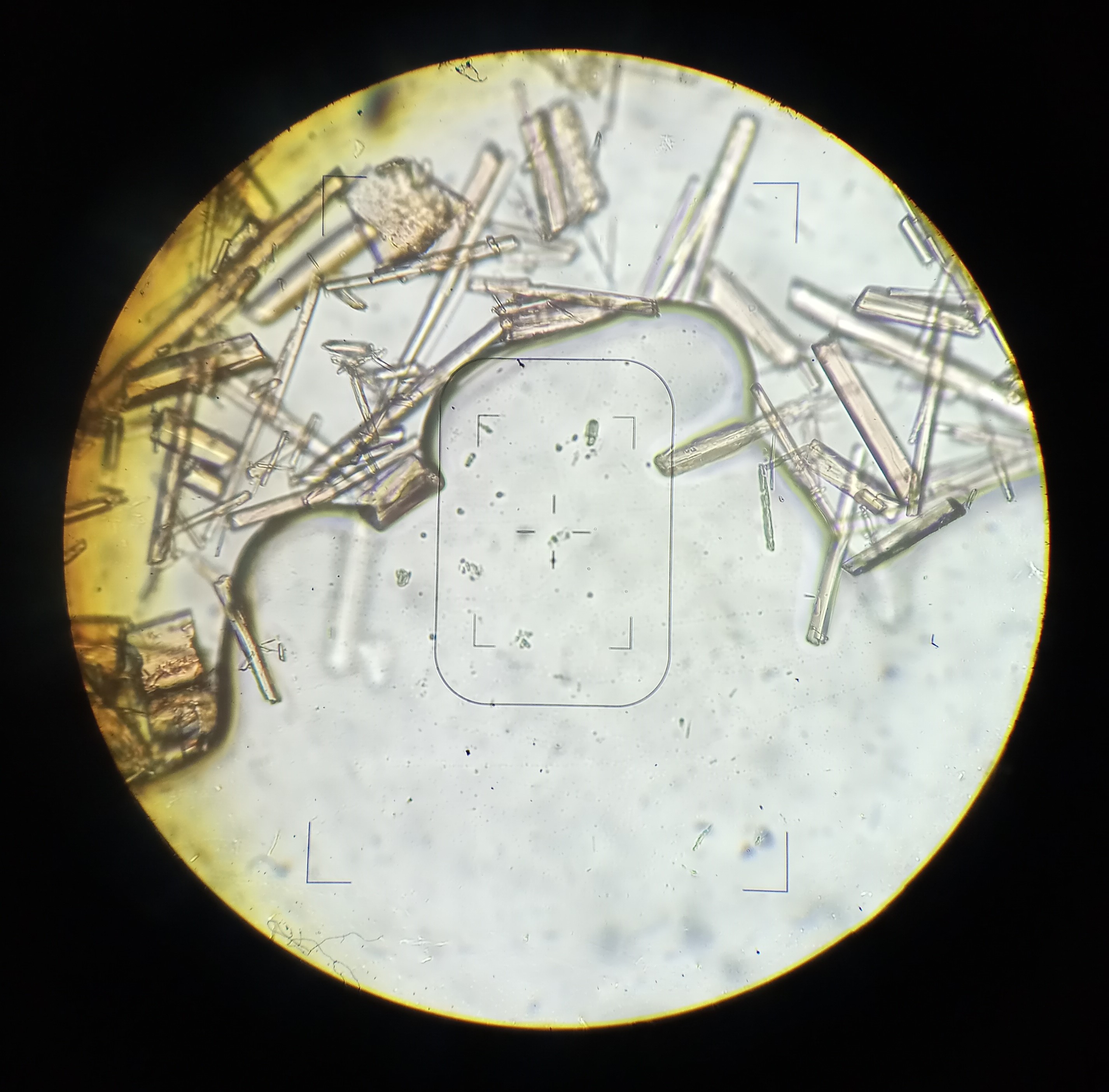 The much larger crystal just on the right edge of the central frame is about 10 micron in diameter (I have an etched slide with a scale to compare).