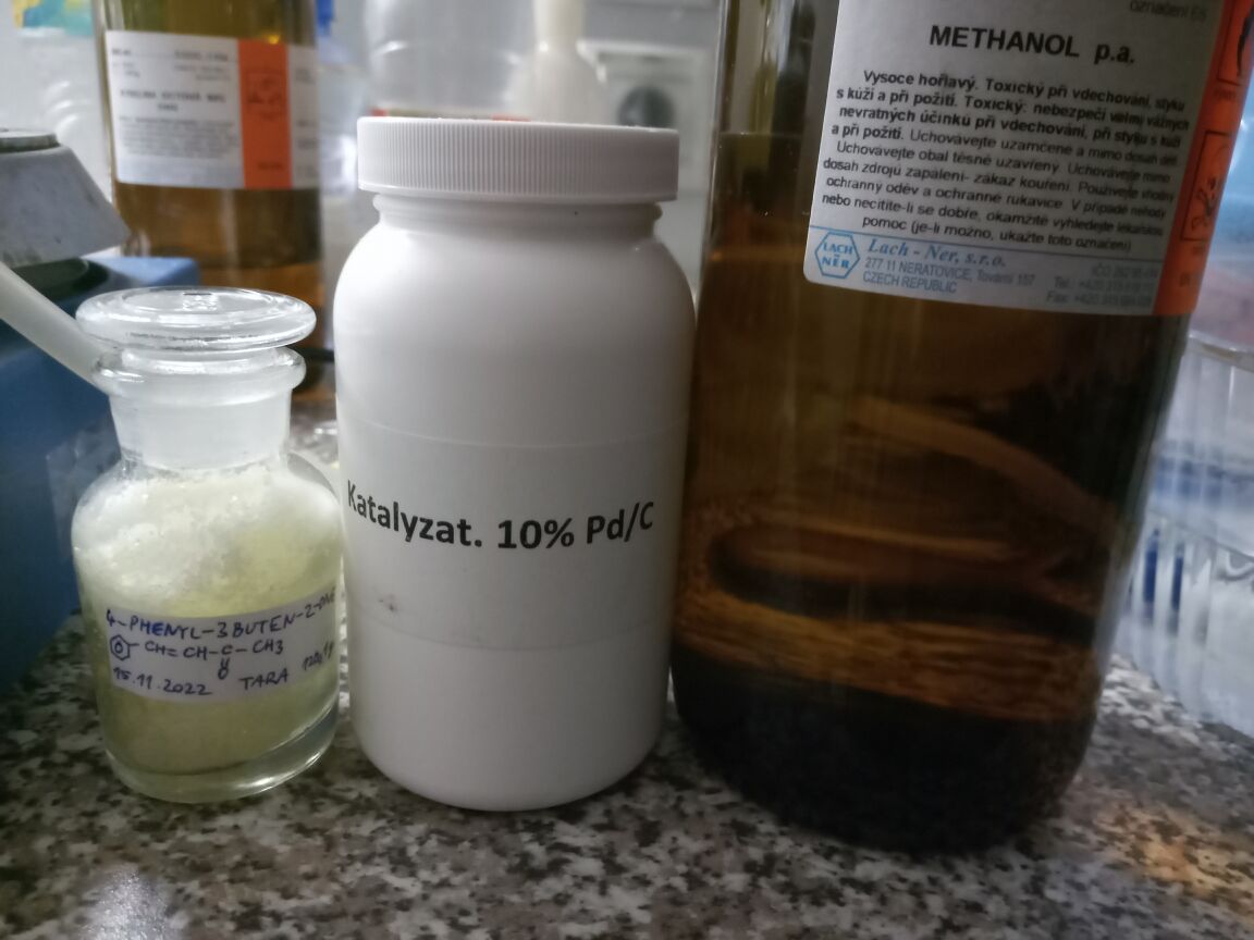 Into 50 ml RBF was put 4,9 g benzylideneacetone and 0,50 g 10% Pd on carbon, stir bar, and as the last was added 20 ml of methanol.