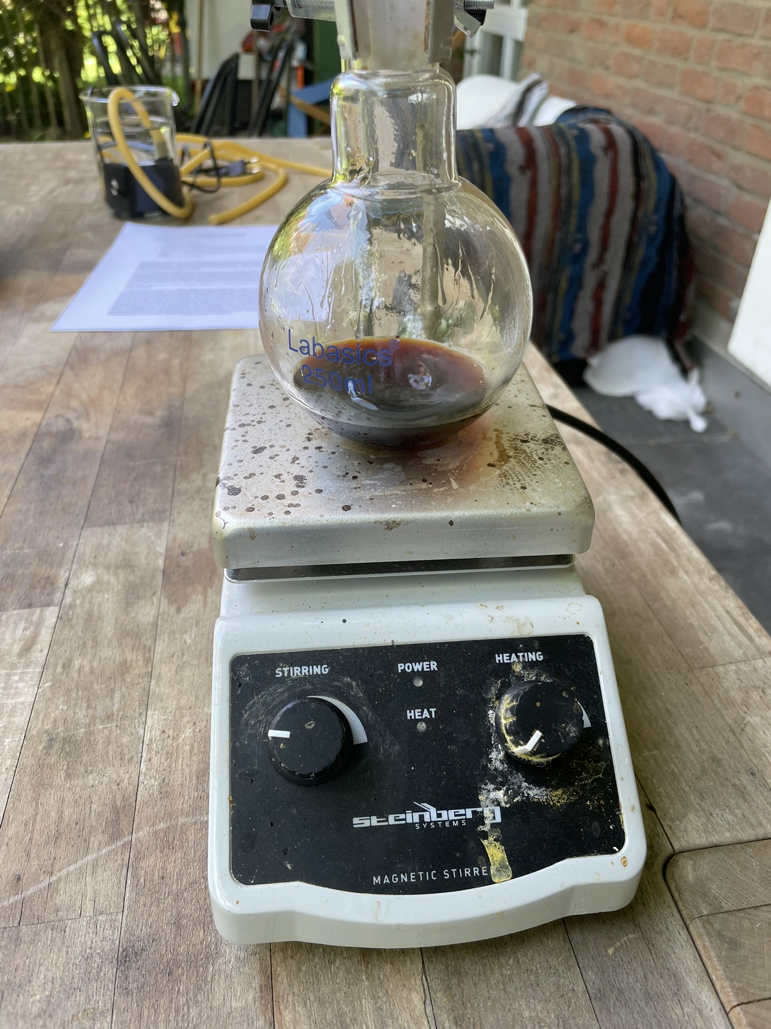 In a beaker, about 8g (doesn't matter too much because it is in excess anyway) of KOH were weighed out and dissolved in 20 mL of MeOH under stirring on a hot plate. The solution heated pretty much, so a larger beaker (min. 100mL) is recommended. A round bottom boiling flask is charged with 9.98g of commercial furfuryl acetate as a yellow oil, the beaker in which it was weighed out is washed out with a bit from the KOH/MeOH solution which immedately discolours to a scarlet red. The entirety of methanolic KOH were addded at once into the boiling flask. The mixture takes on a cherry red colour. I'm not really sure as to where the colour came from, but I was expecting a lot of coloured impurities.