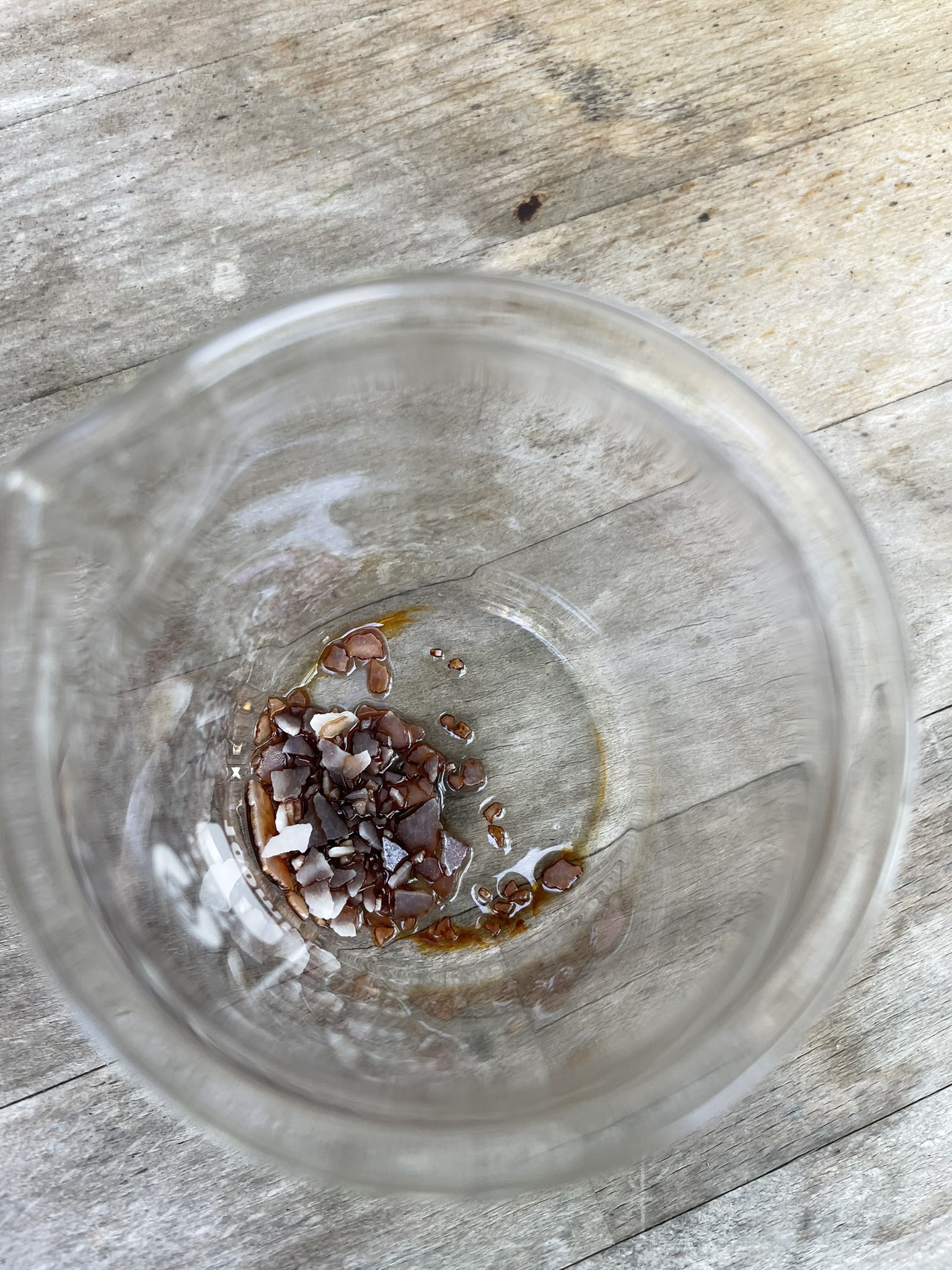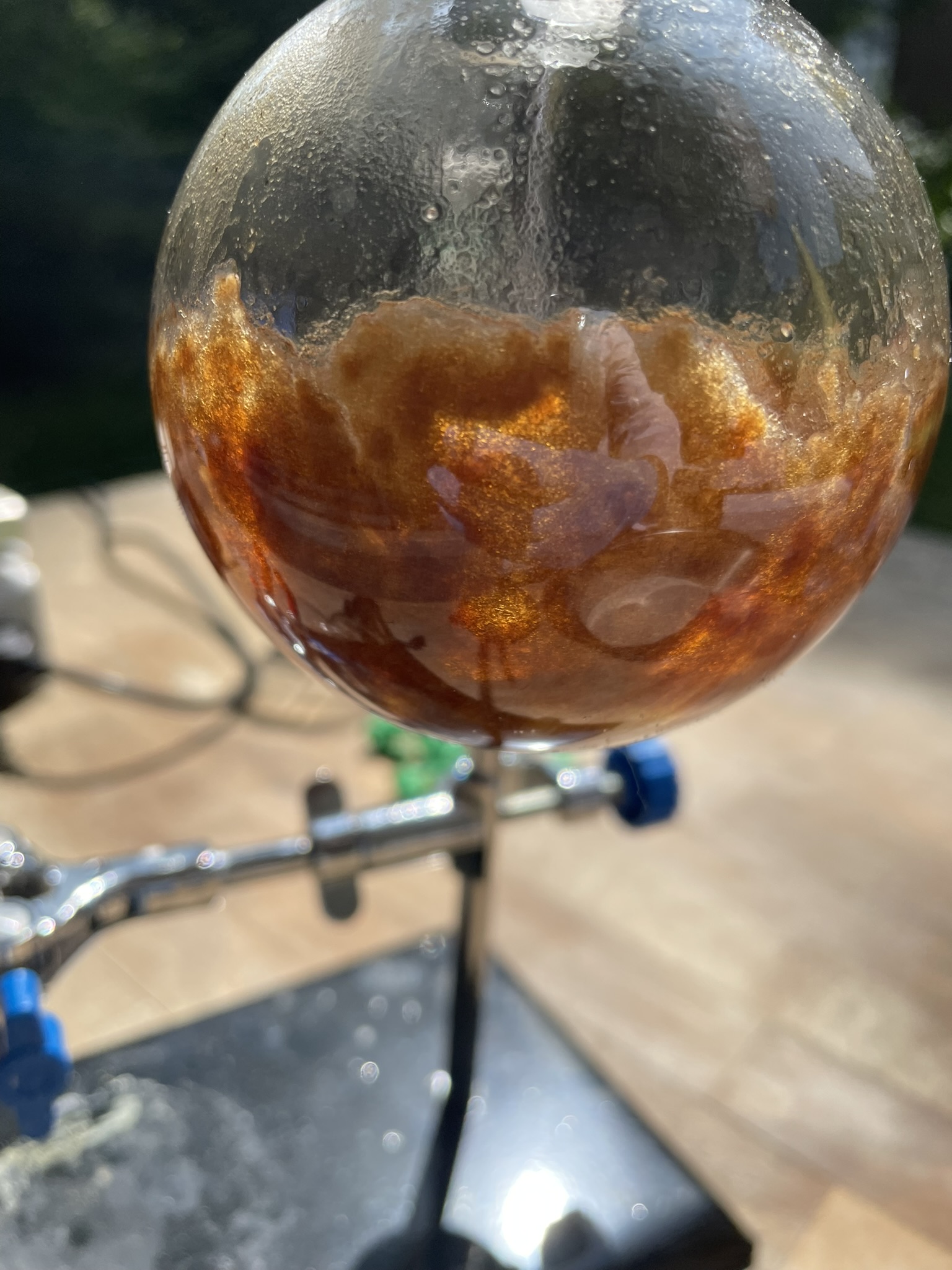 A graham condenser was attached to the flask and heating in a sand bath and under strong heating was applied until reflux. The condenser was water-cooled with tap water. I planned on refluxing for about an hour, but a few minuted in, the exhaust hose of the condenser slipped out of the water reservoir beaker, and spilled water all over my hotplate. Luckily, the FI-switch (I think in english its called rCD?) caused a power outtage, which is why I could clean up the water and resume the refluxing. apart from this little mishap the reflux was unspectacular, the solution stayed exactly the same, colour wise. A few mL of water were added, until I realized how counterproductive this is. I then wanted to distill off all the solvents via vacuum distillation. A vacuum pump was connected to a gas washing bottle with a adjustable gas inlet connected to the distillation setup. This extra measurre was to ensure there was no suckback of liquid into the pump. A vacuum of about 0.1 bar was applied to the setup and the red liquid started bubbling. I'm afraid that this was way to much vacuum, because no liquid condensed in the liebig. The methanol probably directly evaporated out of the pump. The solvents were removed until all solids crashed out instantly as a brown crystalline mass. This was mostly KOAc and residual KOH, as well as some colored impurities.