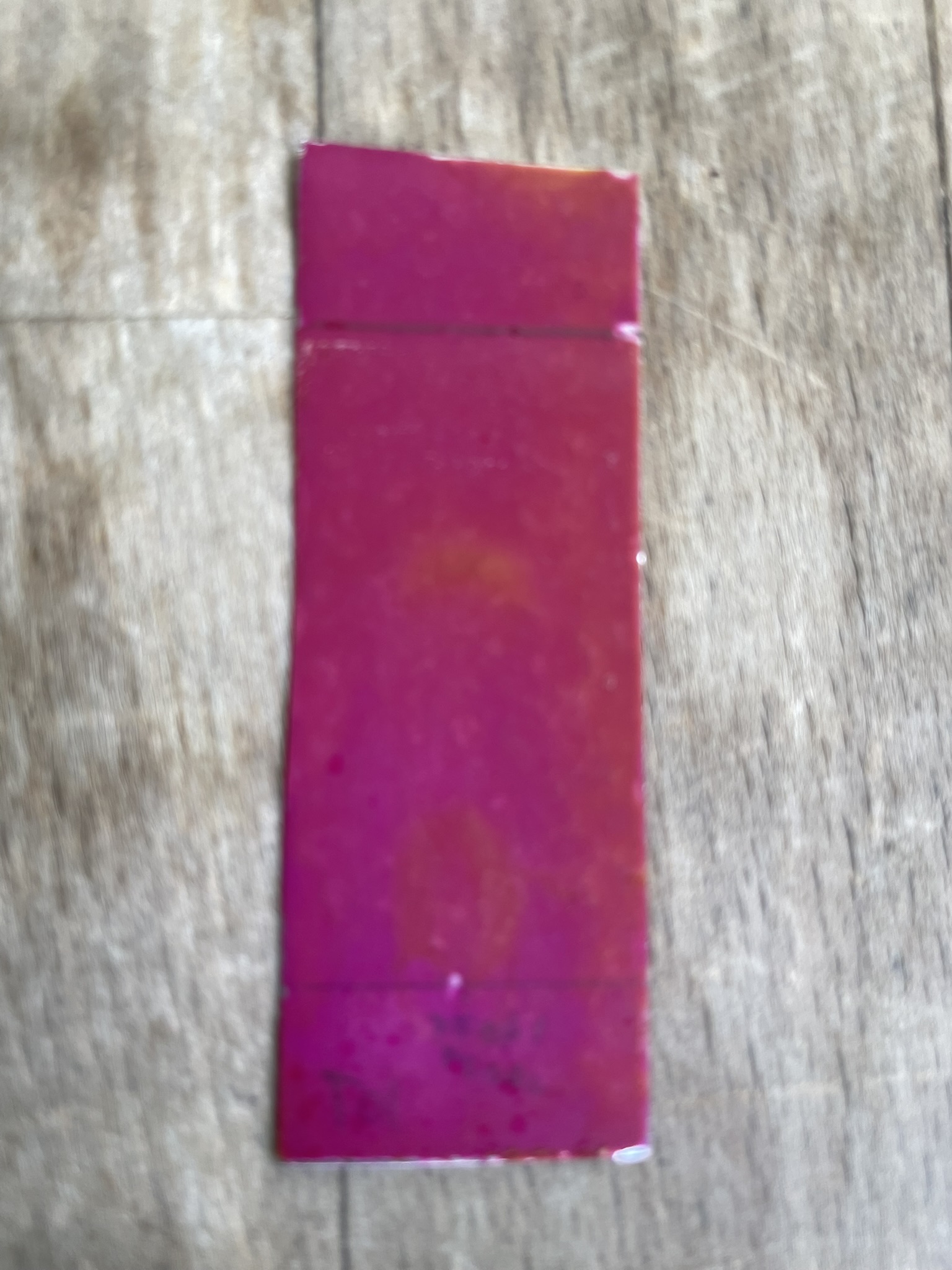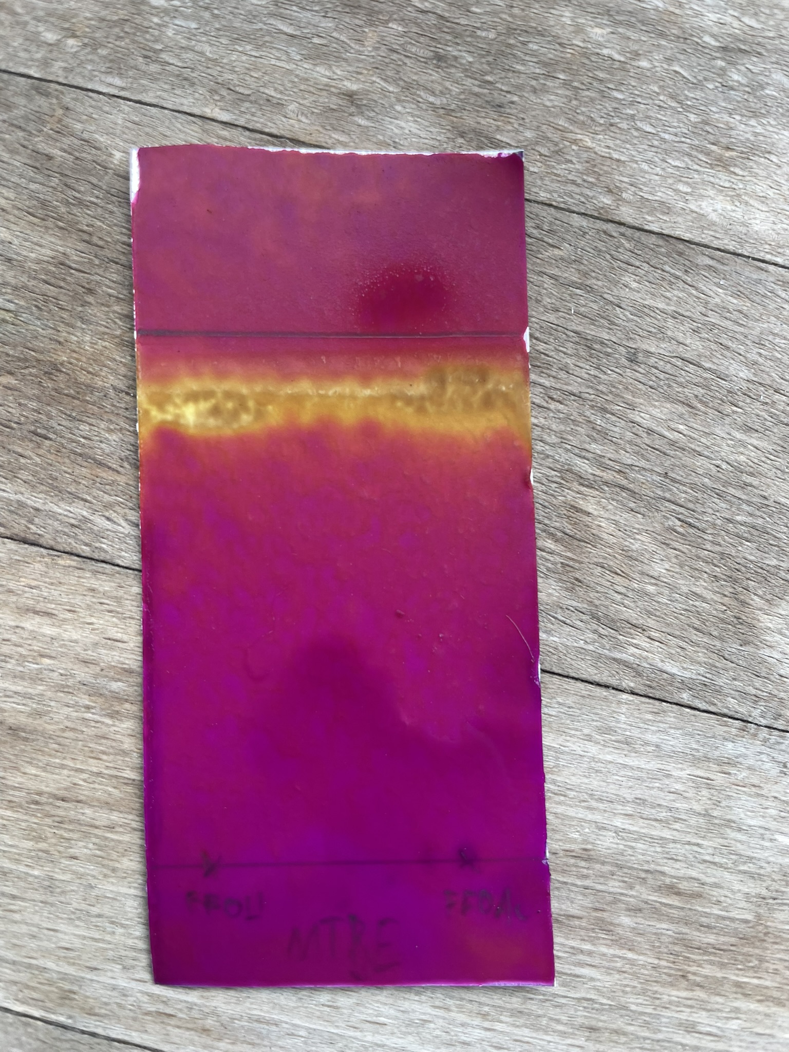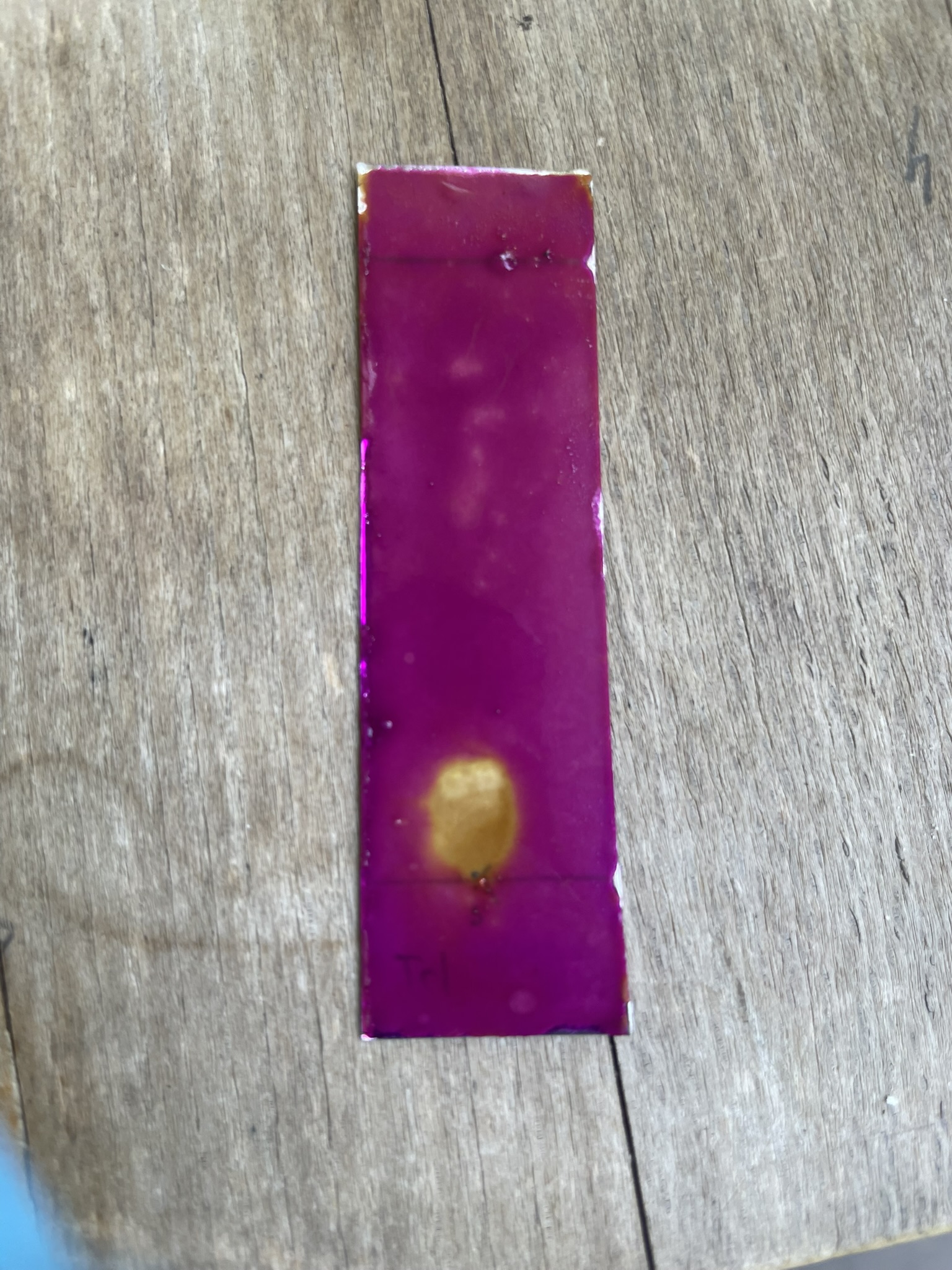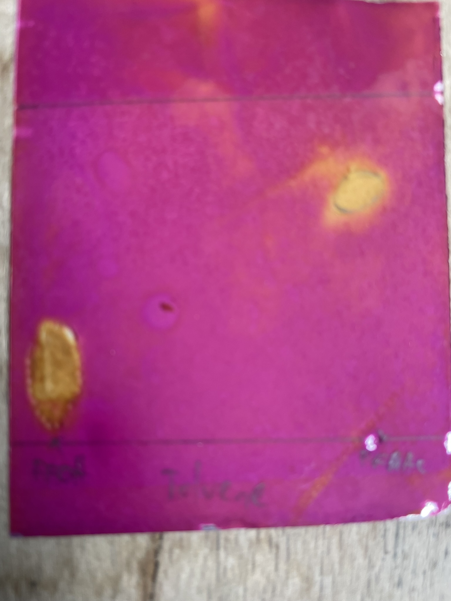 My last try was with pure Toluene as the eluent. Although the solvent front wasn't very straight (I blame my poor plate cutting skills and the dull pair of scissors), I could obtain some promising results: