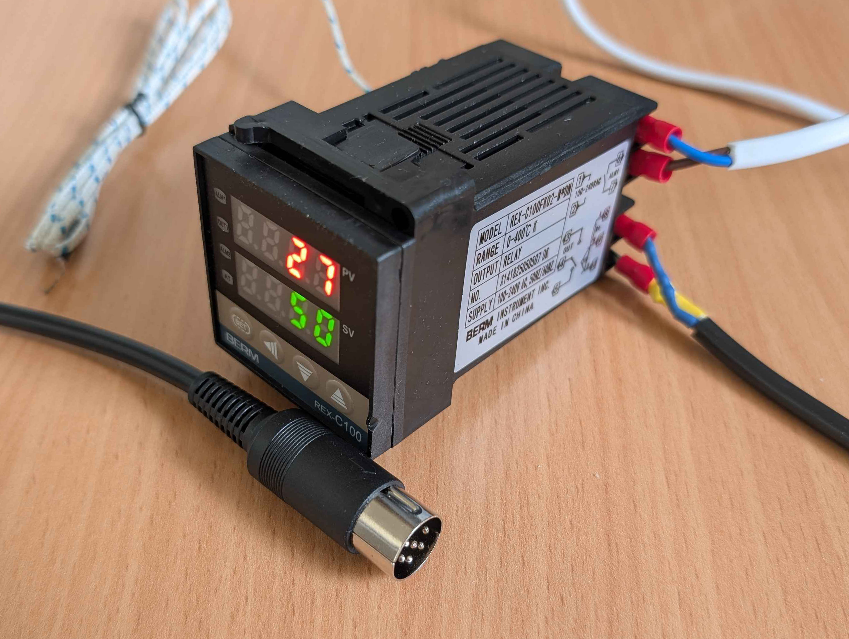 I went with a cheap REX-C100-type controller off ebay.[3] There are several types, and here it is particularly useful to pick a model that controls an internal relay and not an external relay. My model is a REX-C100FK02*M-DN, the M signifies that this has an internal relay. (Check the datasheet in [3].)