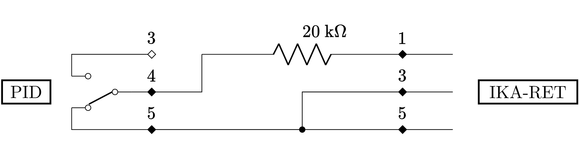 Thus, we can turn the heating on and off by placing a switch and a 20 kOhm resistor between pin 1 and 5, while pin 3 and 5 are shorted.