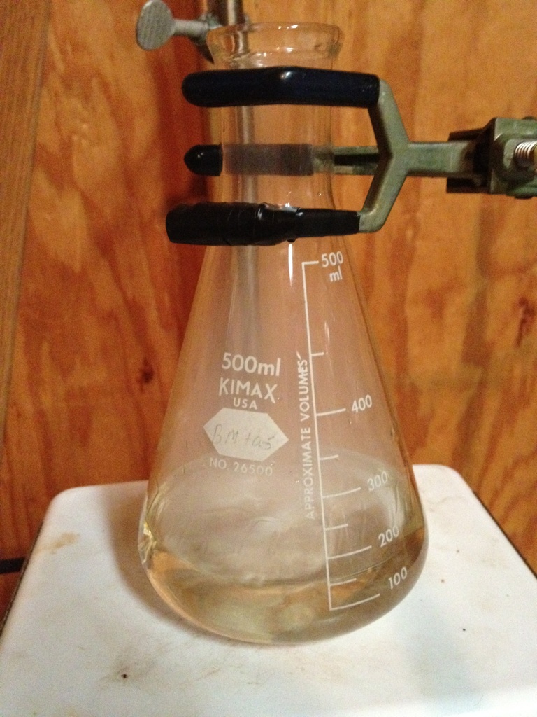 bath used before. Here I was very careful to just keep the water at barely an occaisional boil bubble to minimize heat and sublimation. The liquid
