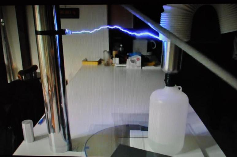 piece of PVC tubing. Salt water makes a decent capacitor. Under it is a piece of 1/8 inch thick PTFE. On top of the poly bottle is a stainless steel